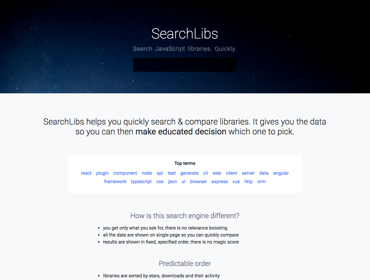 Search & compare javascript libraries. - you get only what you ask for, there is no relevance boosting - all the data are shown on single page so you can quickly compare - results are shown in fixed, specified order, there is no magic score