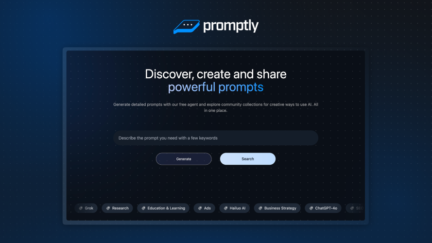Promptly is an AI discovery platform where creators, marketers, and everyday users can explore, organize, and share high-quality prompts for top AI tools like ChatGPT, Midjourney, Claude, and more. Designed to reduce the time spent tweaking AI outputs, Promptly makes it easy to browse proven prompts from the community or generate your own with the help of an integrated AI assistant. You can save your favorite prompts, build step-by-step workflows, and discover how others are getting the most out of today’s leading AI models. Key features include: - Community-generated prompt library with filters by tool and category - AI-powered prompt generator to help you improve or remix ideas - Custom workflows with titles, tags, and media support - User profiles for building and showcasing your personal prompt collection - Leaderboards and challenges to highlight top contributors Whether you're a marketer writing ad copy, a developer working on automation, or an artist exploring visual AI tools, Promptly gives you a better starting point and a structured way to build your prompt library. How it works: Browse or search prompts by AI tool or topic. Generate new prompts or refine your ideas with AI assistance. Save prompts to your personal library, build multi-step workflows, or share with the community. Free to use—no signup required to explore.