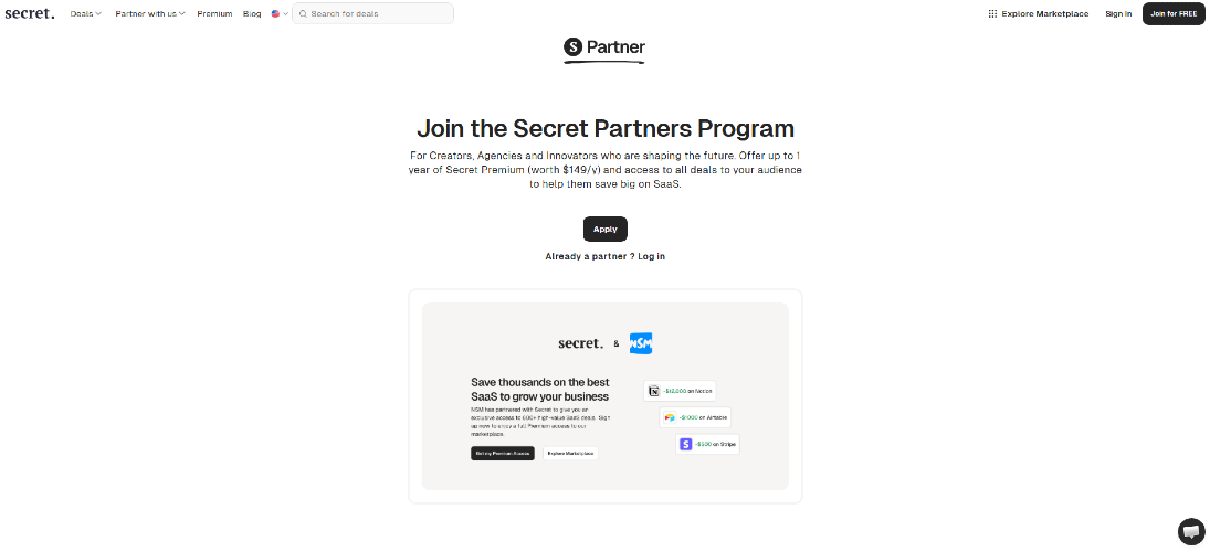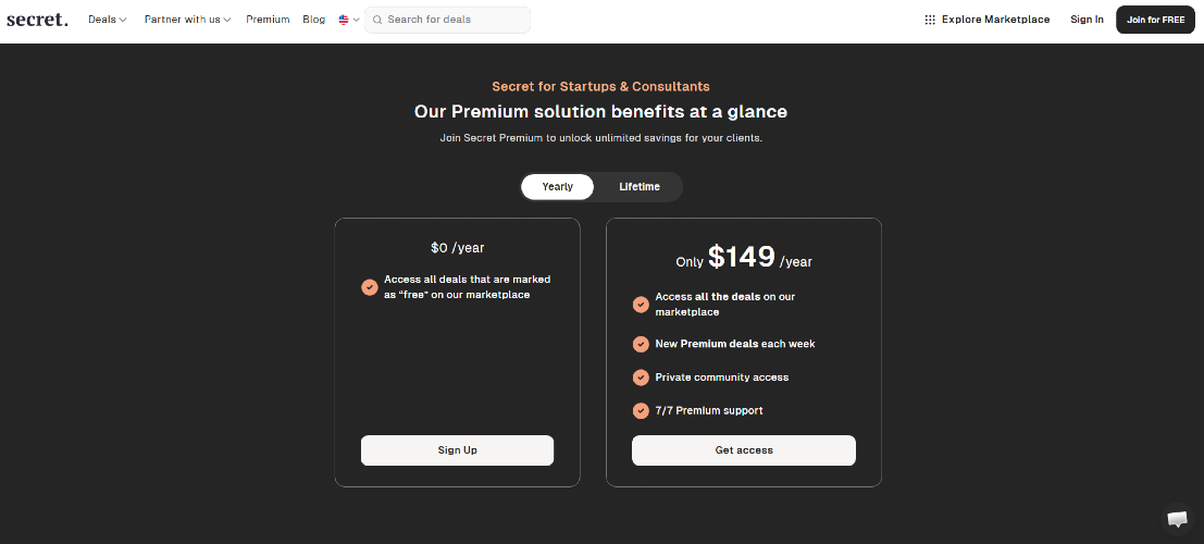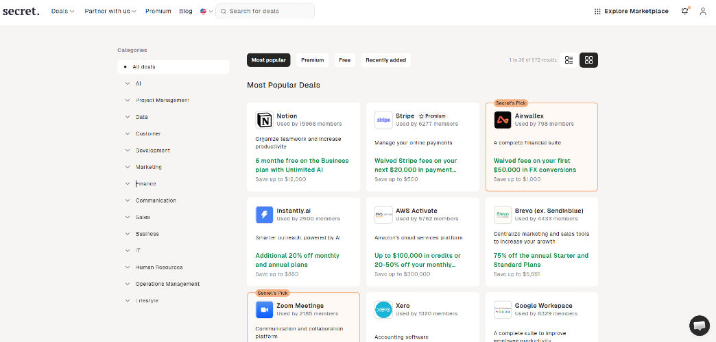 Secret gives you instant access to hundreds of deals and thousands of savings through promo codes and free credits on must-have software and services for startups and small businesses. From cloud to e-mail marketing, Secret gathers all the best tools to kickstart and grow your startup. We negotiate all our SaaS discount codes and coupons directly with the vendors and add amazing new deals each week. Over 500 Premium offers and 200+ Free promotions are already available for you to discover like: - AWS - Stripe - Notion - Airtable - HubSpot - Brevo - Google Workspace - Shopify - DigitalOcean - Make - ClickUp - Apollo.io - Intercom - Mixpanel - Auth0 - Xero - QuickBooks - Fiverr - Wix - Squarespace - Coda - Softr - Mailchimp - Asana - FreshBooks and more plus great alternatives to each tool to help you make the right decision! With possible savings of over $1,000,000 with Secret, 100,000+ startups have already begun saving on the software they use on a daily basis. Gain access also to an ecosystem that provides you with exclusive additional resources like agencies, online training, and experts to help them reach your full potential. Are you running a VC, accelerator, incubator, agency, fintech or marketplace? Check out Secret's Whitelabel & API solution to give your community access to perks from your very own website, not only offering a lot of value to your users but also hassle-free on your side.