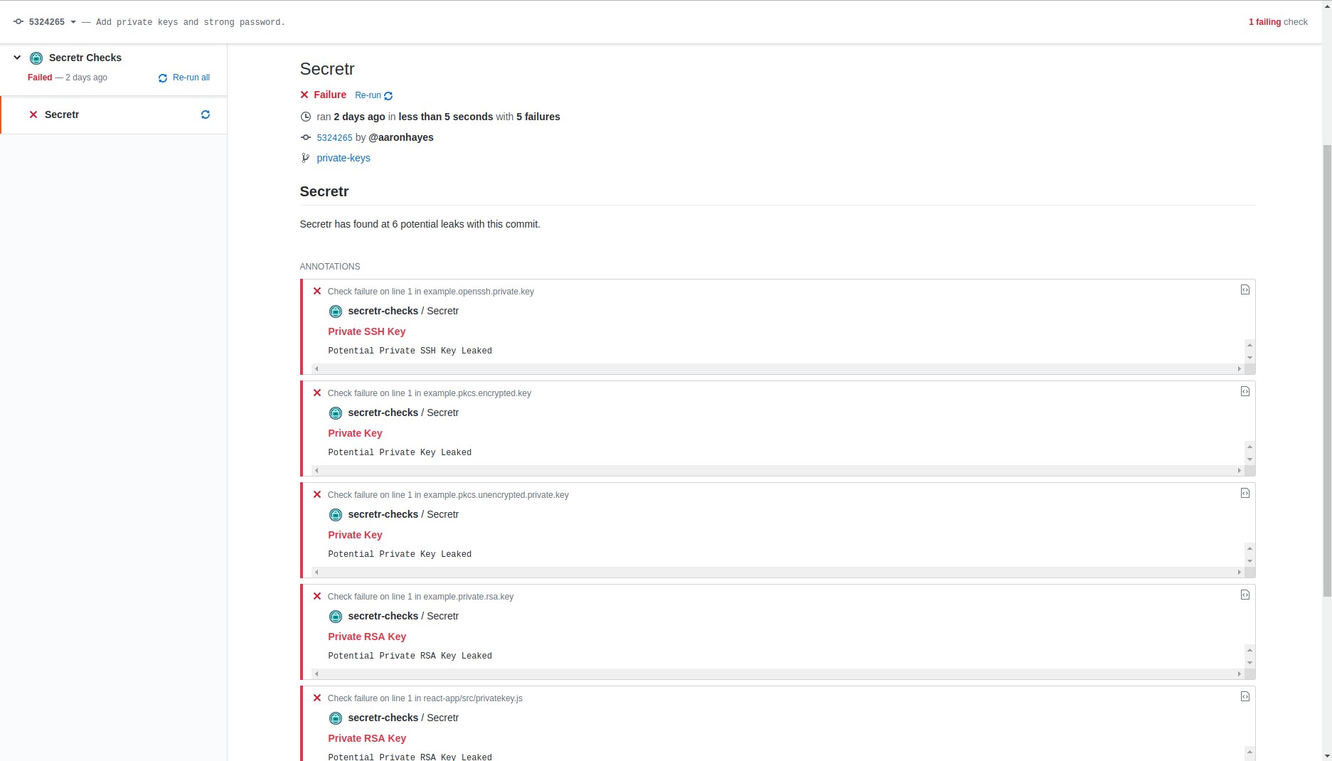 Secretr is a cyber-security start-up which helps protect and secure our user's secrets. We scan your git commits for compromised secrets. We report our findings using GitHub Checks to give you feedback directly integrated your code. Secretr uses a variety of techniques to detect secrets; which we are continuously improving.