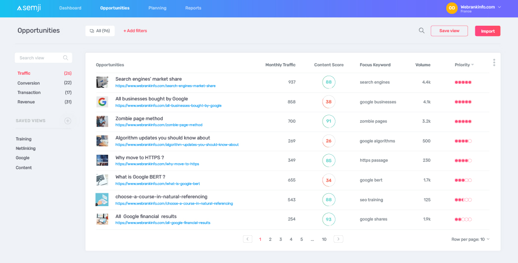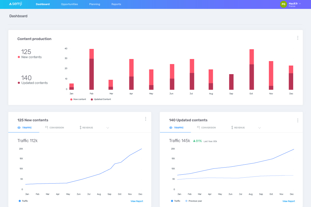 We release our GPT-3 autogenerated content in beta to help you better rank on Google. So we are eager to get feedback on our new features. Please feel free to drop us a line at marketing(at)semji.com or to launch a free trial. And here's what our product is doing : Semji rescues bad investments on your content writing. Earn traffic. Decrease time per content. Multiply your ROI. - Identify your best opportunities - Write with inline brief and SEO guidance - Retrieve your data for instant reporting - Manage your content production and optimization. And much more, AI-assisted writing, etc.