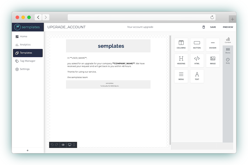 Semplates is an email editor solely to provide a user interface for AWS SES. AWS SES is Amazon's email service (similar to Mailchimp or Sendgrid), but it does not provide a graphical tool to edit and manage your email templates and is therefore around 100x cheaper. AWS SES is only usable via the CLI (command-line interface) and therefore its focus is on developers and only developers. It's widely used if a company is already using AWS and our idea is to enable non-developers to build and manage all templates easily and create beautiful emails using drag-and-drop functionalities.