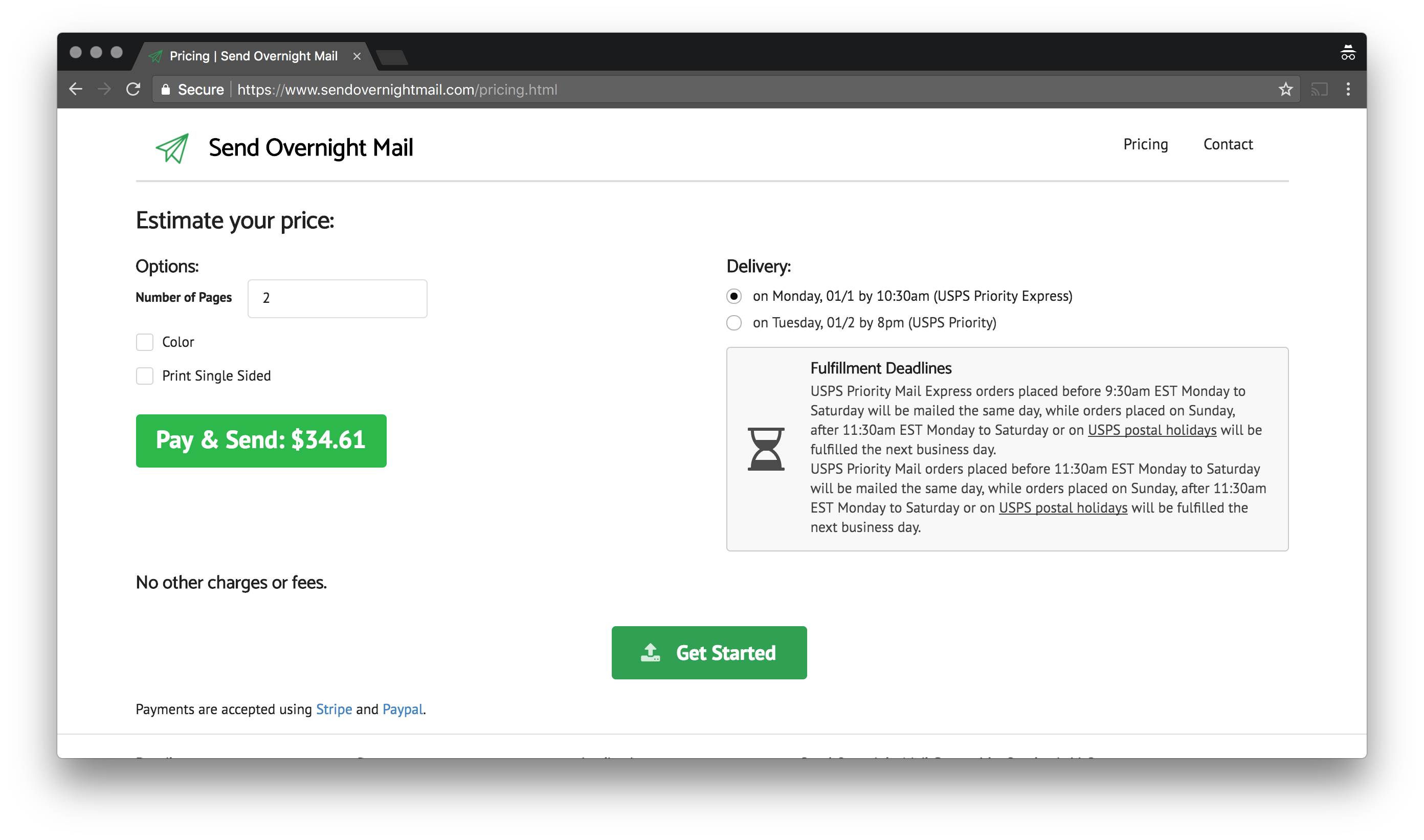 SendOvernightMail is the fastest and easiest way to print and mail documents, letters and forms online. Here's how it works 1. Upload a document 2. Enter a destination & return address 3. Choose your speed 4. Hit Send Sendovernightmail was designed for people who have time sensitive documents to share, and we make it possible to get mail out in the same day, and delivered within 1 - 3 business days. This means taht there;s no longer any need to get out of your home or office, and go to the post office and wait in line. A Fedex integration is also in progress, which will enable customers to send mail globally via Fedex's various service levels.