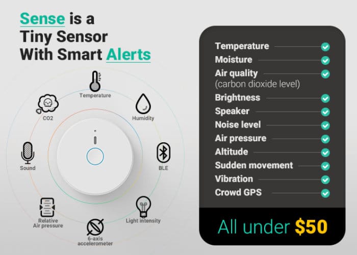Get smart alerts with insights about your environment and air quality. Sense is a tiny device that can monitor various atmospheric variables including temperature, moisture, air pressure, light intensity, noise level and CO2 level, movements, and more. Thanks to multiple built-in sensors and machine learning, Sense learns about you and your environment and sends you push notifications containing useful information and recommendations about the environment. It gets more useful and accurate as you use Sense longer and longer. Sense is so tiny that it can easily affix to any appliance, wall, or backpack. You can take it with you anywhere or install it in a place to monitor the environment locally and remotely 24/7. Sense can be used with the corresponding MicroBot Sense app (available on iOS and Android), IFTTT, Amazon Alexa and Google Home. It connects to your smartphone or optionally to a smart hub via Bluetooth Low Energy.