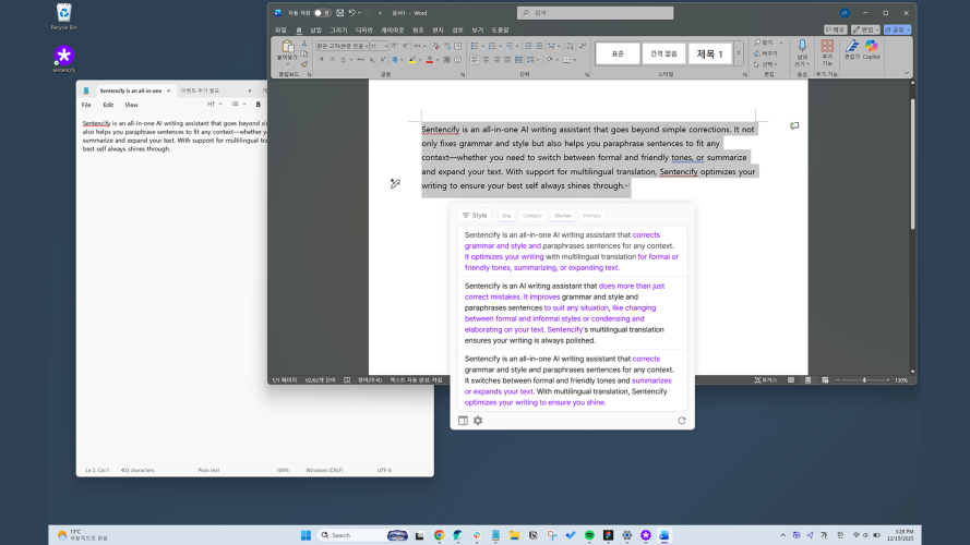 SENTENCIFY is a 100% free AI paraphrasing tool that brings premium rewriting capabilities directly into your workflow. Unlike web-based editors, it integrates seamlessly with any desktop app or browser to offer three unique sentence variations instantly without copy-pasting. Experience the best free alternative to Quillbot and Grammarly without any paywalls. Key Features - 100% Free Premium Paraphrasing: Get three high-quality rewrite options for every sentence and adjust tone/nuance completely for free. - Seamless Workflow Integration: Paraphrase directly inside apps like Notion, Slack, and Word without switching tabs or copy-pasting. Benefits 1. Unlock Premium Features for Free: Access advanced tone adjustments and purpose-specific rewriting at zero cost. 2. Three Unique Rewrites: Unlike basic tools that offer one option, Sentencify generates three distinct high-quality variations for every sentence. 3. Multilingual Power: Specialized in translating and polishing nuances between English and Asian languages (Korean, Japanese, Chinese), making it ideal for non-native speakers. 4. Privacy-Focused: No need to paste your sensitive documents into a web browser. Sentencify works locally over your applications.