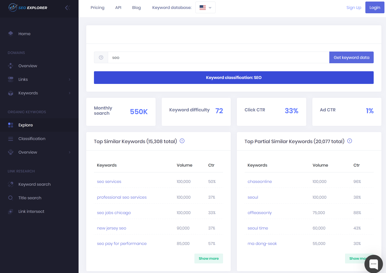 SEO Explorer is a budget platform for SEO research, that offers free/paid tools for SEO research: USA/Israel keyword database for keyword search, backlink/outlink research tools, search engine for links, backlinks opportunities beside competitor research, powerful API, URL/Text classification filtering
