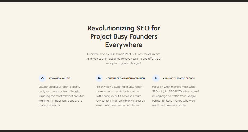 SeoBOT: Your SEO, supercharged by AI. Expert Google keyword targeting for peak performance. Save time and gain traffic. The smart choice for creators. Member of marsx.dev family Got a question or wanna say hi? I’m on Twitter: @johnrushx