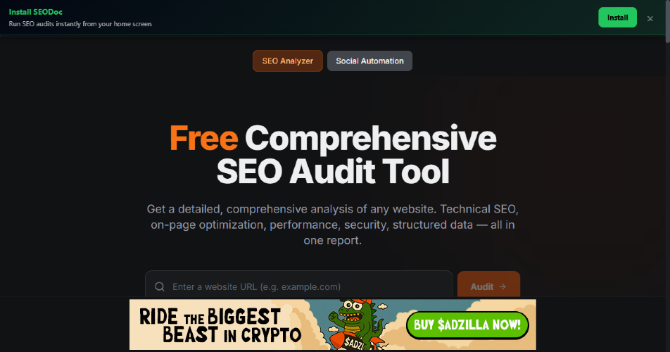 SEODoc is a free, comprehensive SEO audit tool — analyze any website's technical SEO, on-page elements, page speed, security headers, structured data, and content quality in seconds. Features: • Full technical SEO analysis (crawlability, indexability, sitemaps) • On-page SEO scoring and recommendations • Page speed and Core Web Vitals analysis • Security header checking (HTTPS, CSP, HSTS) • Structured data / schema markup validator • Content quality assessment • Detailed audit reports with actionable fixes • Blog with SEO guides and checklists No account required. No credit card. Completely free. Perfect for developers, marketers, and website owners who want professional SEO insights without expensive tools.