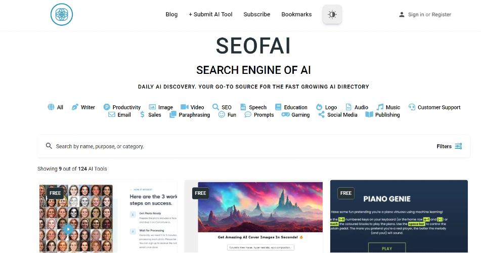 Seofai is your reliable AI directory, a dedicated space where you can easily explore and access a wide array of AI tools. Whether you're a professional, a student, or just curious about the world of artificial intelligence, Seofai is here to simplify your search for AI resources. Our platform serves as your guide, providing an extensive list of AI tools, neatly organized and readily available for you. With Seofai, you can effortlessly find the AI tools you need to take your projects and knowledge to the next level.