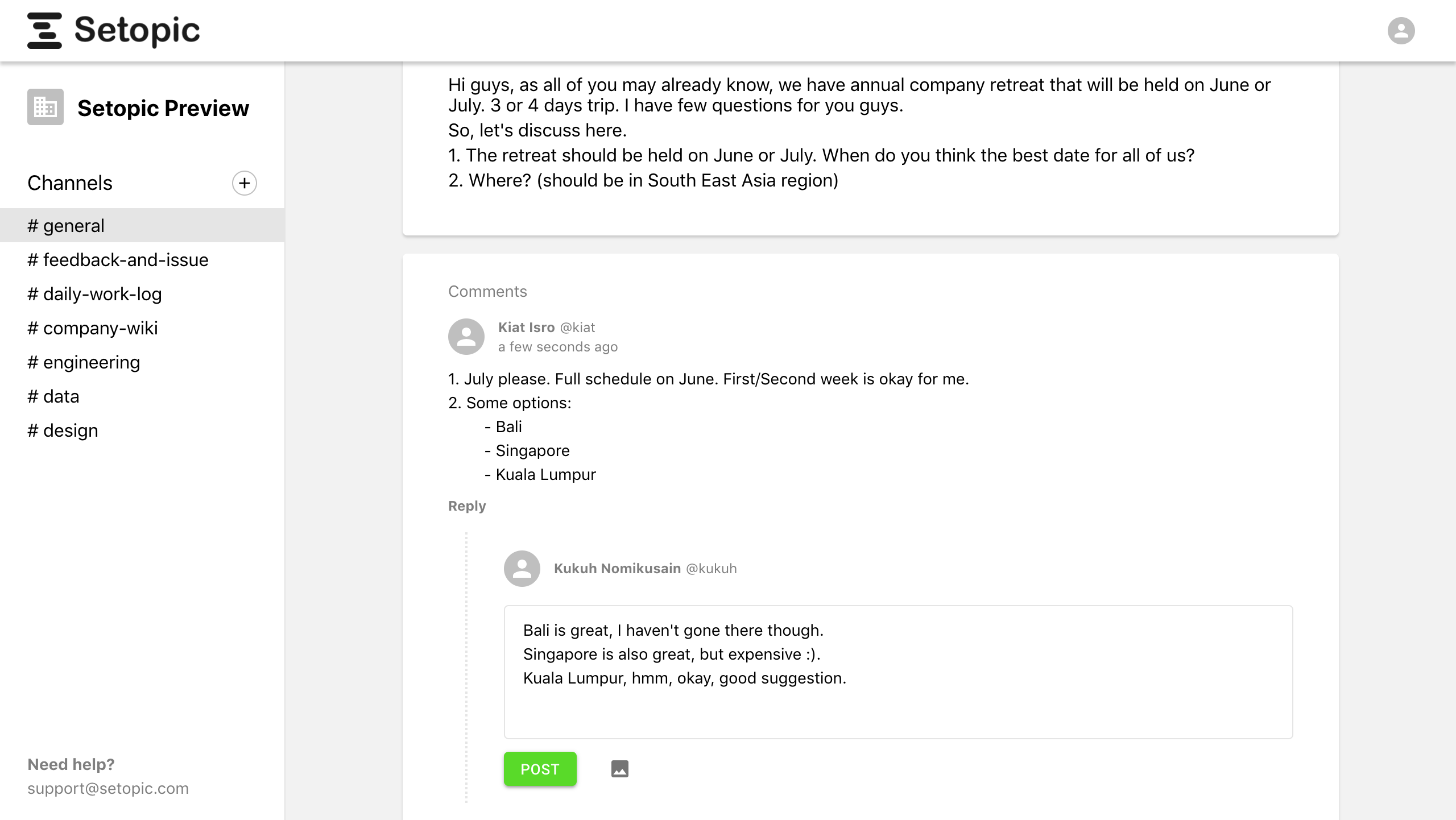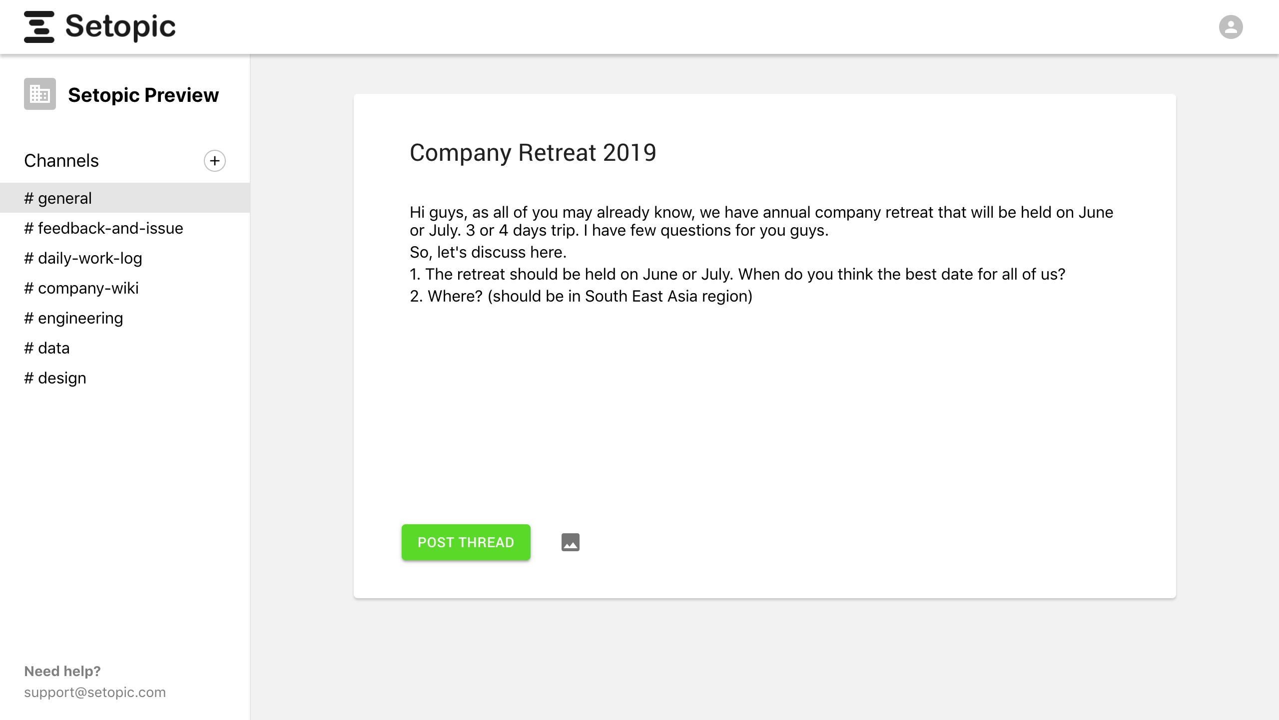 Slack and Skype are fast, instant, and fun. But sometimes, they are too fast, so that old conversations easily got fly away. We can move from one discussion to another discussion instantly, just bring another topic on the same table. The problem will raise later, when we need to revisit the old discussion in the future. When that time comes, your old discussion is already covered in dust. You and your team members may need to discuss for the same problem again. It's hard for new team members to understand the old discussion. And it's kinda bothersome to tell new members about it. Especially if the discussion was a long one. Some questions (e.g. "Why did we do this instead of this?", "Why did we use this service?", "How did we solve this problem previously?") are raised frequently, and it's bothersome to explain them over and over again. But, knowledge sharing is still very important thing to do to make successful teamwork. Setopic can help you solve this problem. Setopic is a thread-based communication app. You can discuss a topic in a thread, and discuss another topic in another thread. This way, your team discussion will be focused, and it can be used as reference when similar problem is happened in the future.