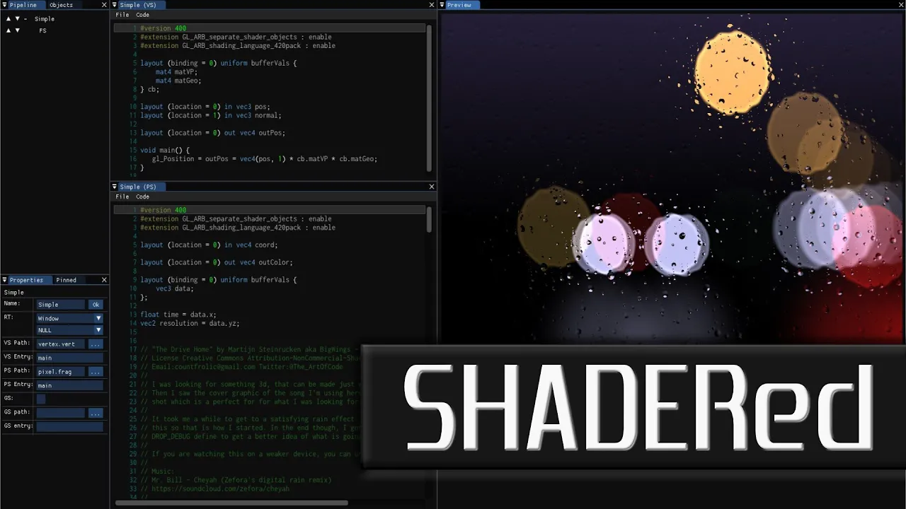 SHADERed is a lightweight tool for creating and testing HLSL and GLSL shaders. It is easy to use, open source and frequently updated with new features. It has many features that the competition is lacking. There are various GIFs and screenshots of the tool in action that you can check out on https://www.github.com/dfranx/SHADERed . It is completely free and the source code is licensed under MIT license! It currently only works on Windows but we are porting it to Linux so please consider supporting SHADERed and its future development.