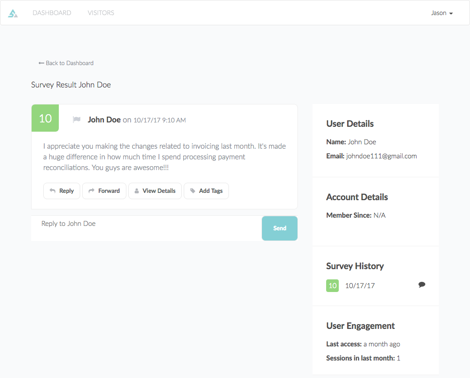 ShadowAide NPS surveys monitor your customers' perception of your product throughout their lifetime, via in-app surveys which provide highly detailed and actionable product feature feedback, as well as emailed surveys which capture a more general review of your product.