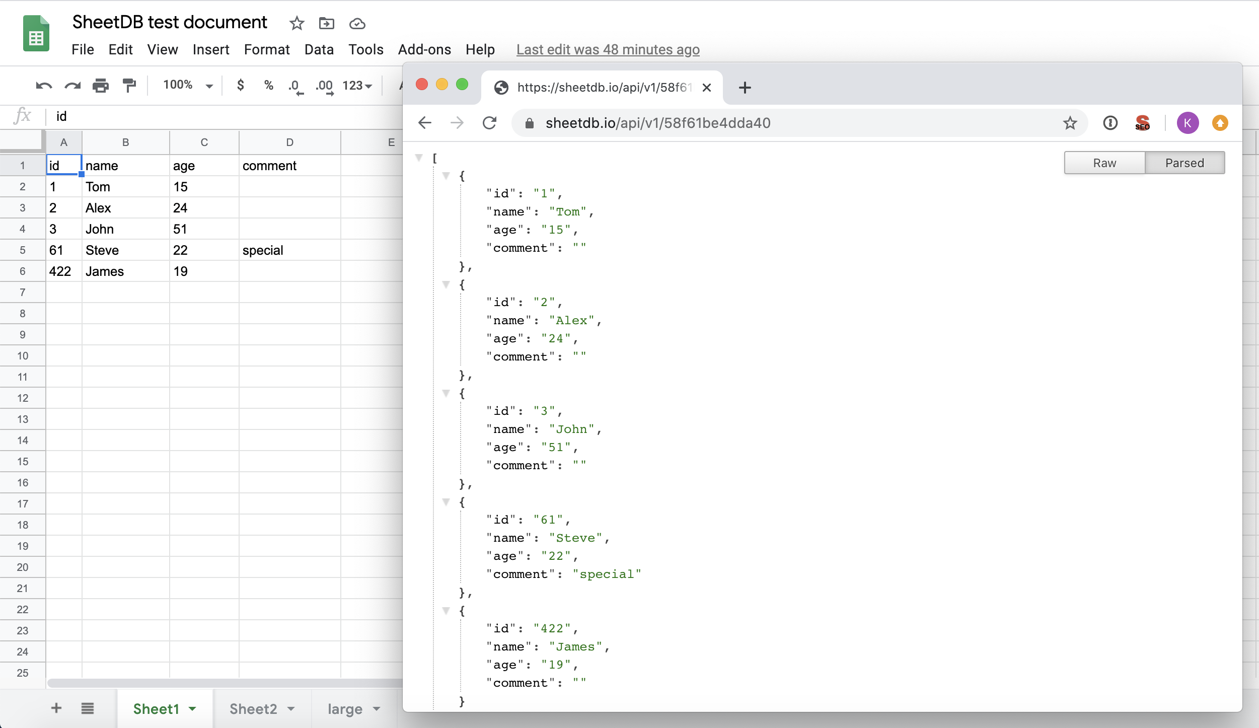 SheetDB will turn your sheets into a JSON API, easy to integrate with other tools and all programming languages. We have prepared many libraries working with common tools, other API's and programming languages.