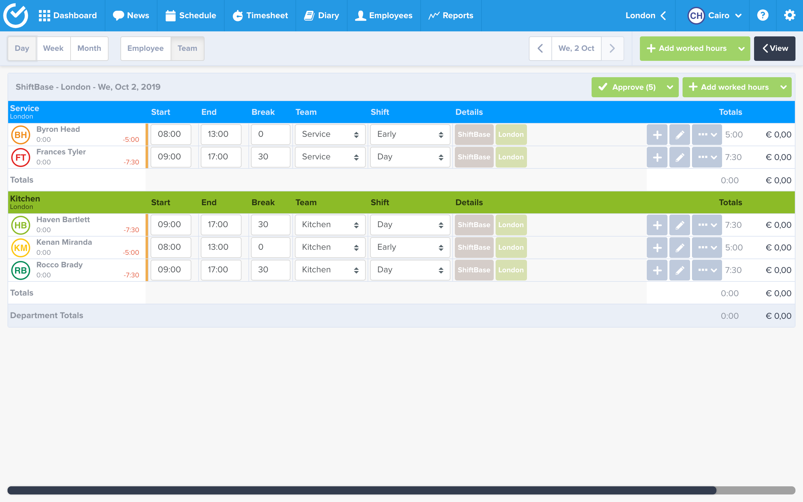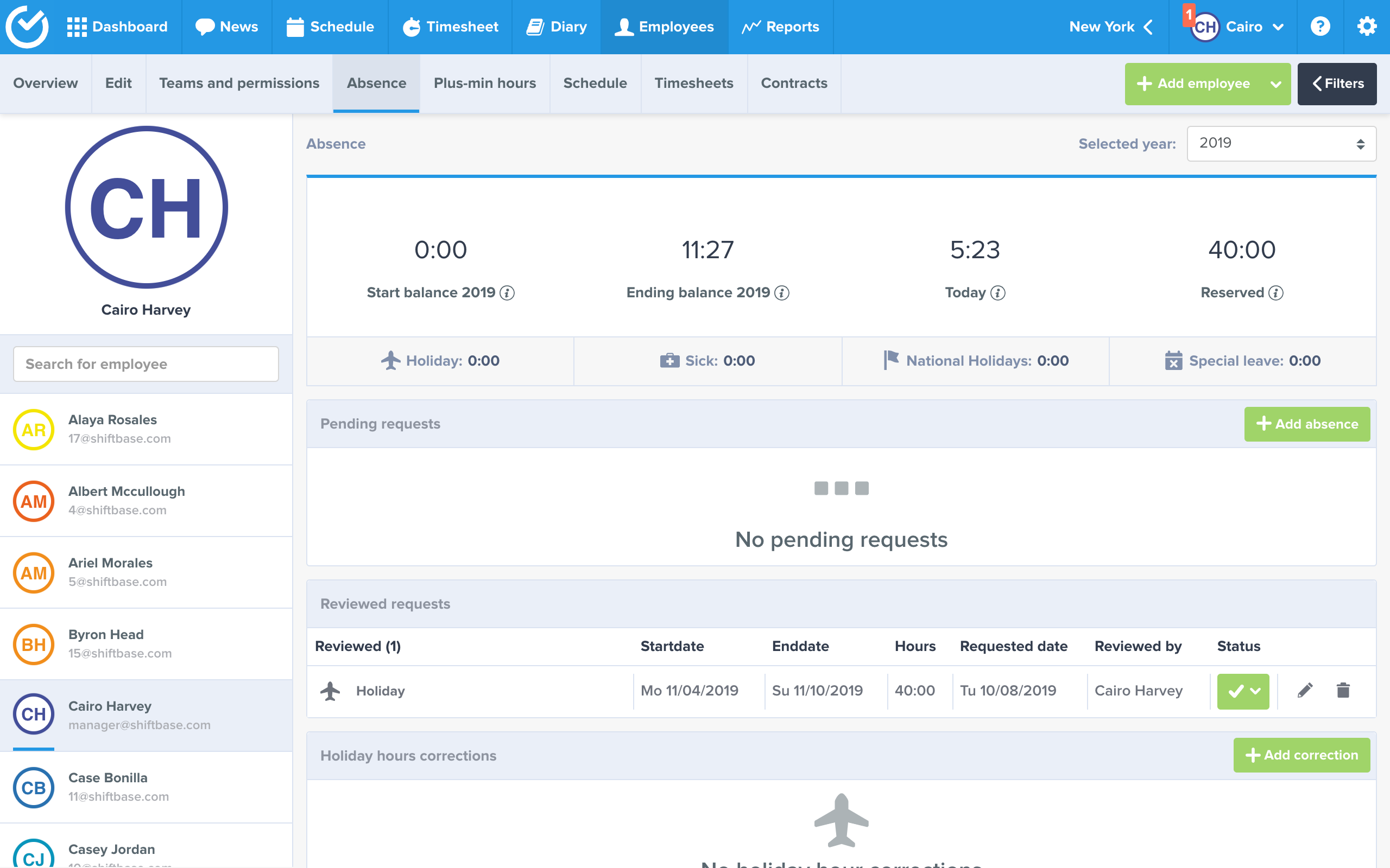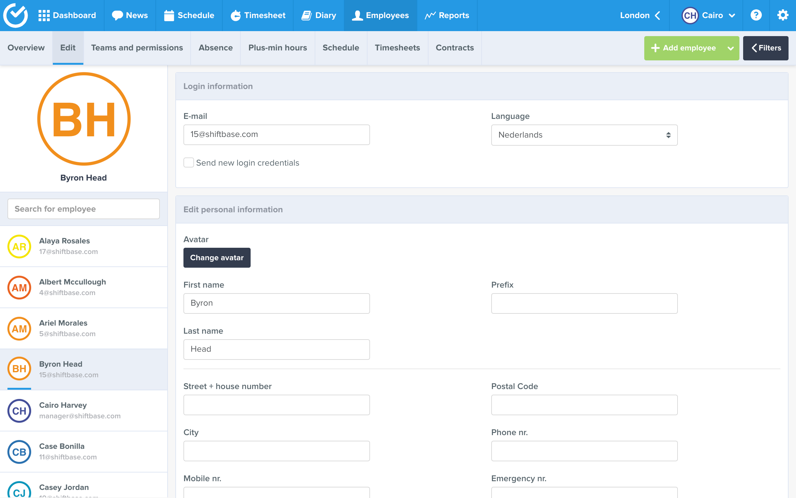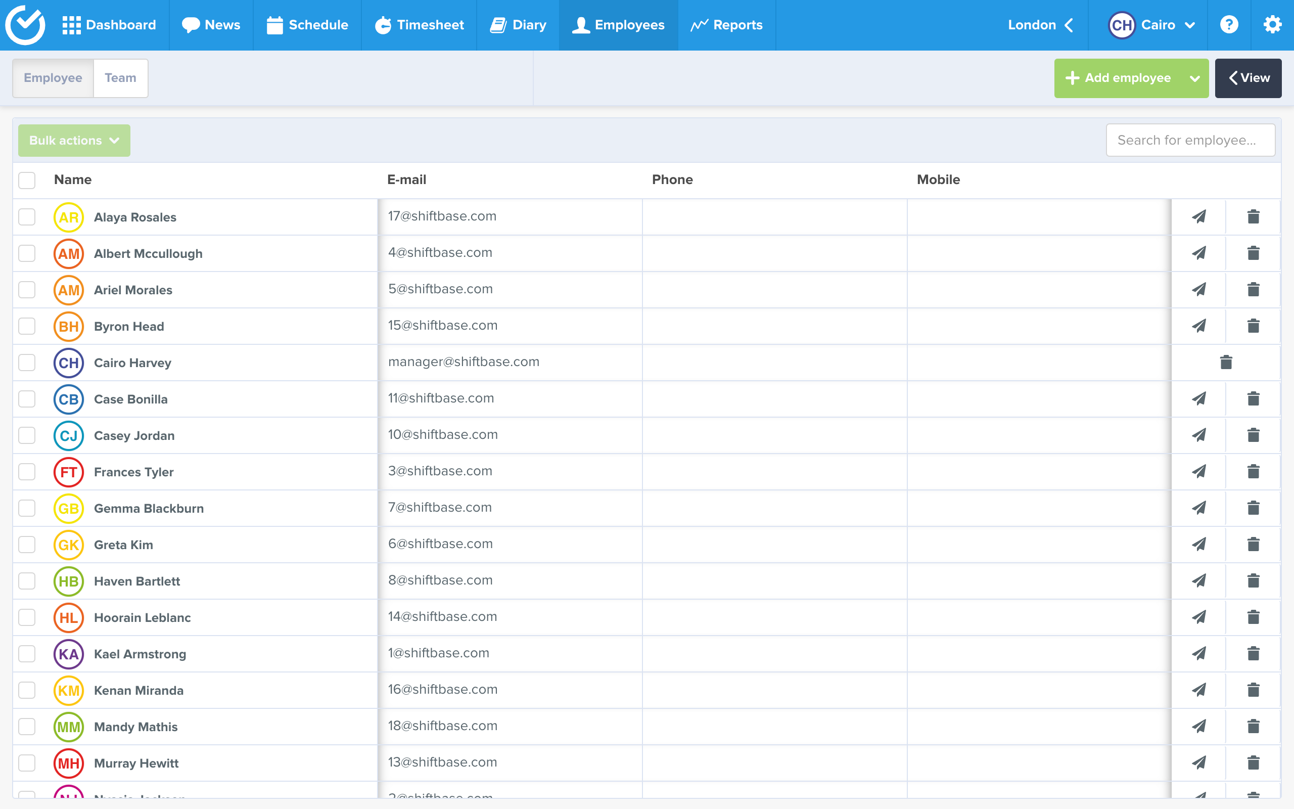 ONLINE SCHEDULING AND TIME TRACKING SOFTWARE To use this app a Shiftbase account is required. You can sign up for a FREE TRIAL account at https://www.shiftbase.com Shiftbase is an online application for scheduling and time tracking. With our application you can easily and quickly create a schedule with ease while keeping a tight control on labor costs. Because all data is stored online, users can log on from anywhere to view their information. Shiftbase is used by many different companies all around the world. Our app includes the following functions: SCHEDULING - Manage employee schedules; - Schedule based on budget; - Schedule based on percentage of total wage; - Option for employees to exchange shifts (with approval of the manager). - Invite employees for shifts - Manage availability. - Skills TIME TRACKING - Manual registration by employee or manager. - Clock in/out (based on location or IP address). - Automatically based on the schedule. - Online time registration terminal; EMPLOYEE MANAGEMENT - Time off requests. - View overtime. - Post news items and start a discussion. GENERAL - Manage settings for permissions, locations, absence types and others. - Public API available.