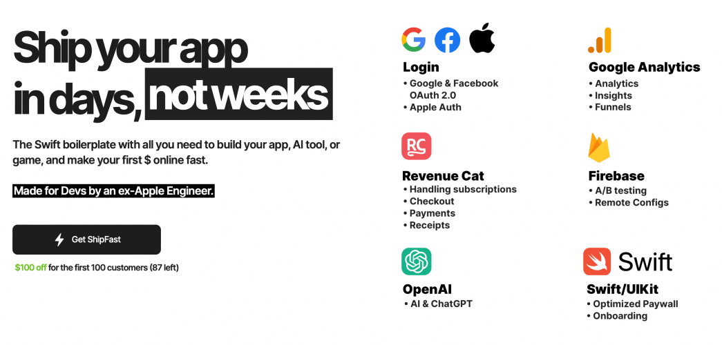 What is ShipAppFast? The Swift boilerplate with all the stuff you need to get your app in front of customers. From idea to production in 5 minutes. Hi I am Luca, ex- software engineer who is currently working as indie dev on a series of apps. I was able to launch 3 apps in the span of 3 months while working a full time job. I realized that the reason why I am fast is that I have a series of modules I always use for my apps to avoid much boilerplate code to be written again and again. Available modules - Login Users ( + social) - Analytics - Logging - Paywall - Payments - AI - Experimentation and A/B testing - Onboarding Coming Soon - 2D Open World Gaming SDK [~25K LOC] - Gamification (streak, badges, etc.) - Notifications (keep users engaged) - And more