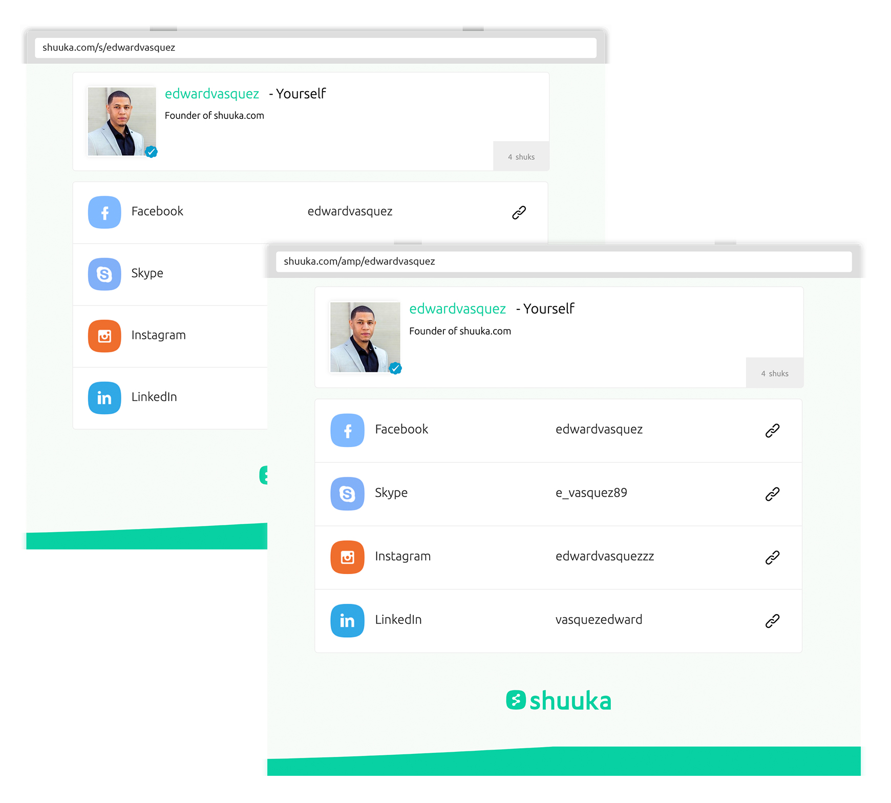Shuuka - All your names in one place ? Mission ? We know that there are many services that offer something similar, but we are very confident in our concept and we are constantly improving it. Fake Accounts, one of our goals is to make a main profile where users can verify what the real accounts are and with the help of the community make a list of the fake account. We do not want shuuka to be another of your profiles, we want shuuka to be the way for the user to enter in all your social networks. We take care of your data, it is one of the most important things that is why our data is stored in Switzerland. ? News? - Improved performance - AMP Profil page. - Special page without shuuka menu. One more thing?Our new Wordpress PLUGIN where the user can integrate shuuka in his own page with his own domain and url. The user just have to install the plugin insert the secreteKey and choice the URL that they want. All developers are free to make their own plugin or design on their website. For that we put at your disposal our API Link that will give you all the user information you need to make that personalized page. Yes, only Shuuka allow you to use your own domain to display your social media lists. List of shuuka features: Support 5 Language (en,de,it,fr,es) Short Link (shk.qa) User Link (with menu) User Link (without menu) AMP Link Smart Links (yourUrl/facebook, yourUrl/twitter…) Link Tracking Search Engine Fake Account report List of popular users QR-Code Coming soon: Retargeting Scheduled links Youtube videos integration Music player ? My person? I’m Eddy, I am 30 years old I have two children almost 3: P I live in Switzerland, first of all I am FATHER, entrepreneur and I work for the start-up of Virtual Reality HEGIAS AG (hegias.com).I wanted to do this project because I have many ideas and I didn't want to leave it all in my head :) ? thanks Thank you all for sending me support messages, bug fixes and ideas. With your help we will continue to grow and make things easier on the world wide web! Greetings and thanks Edward V.