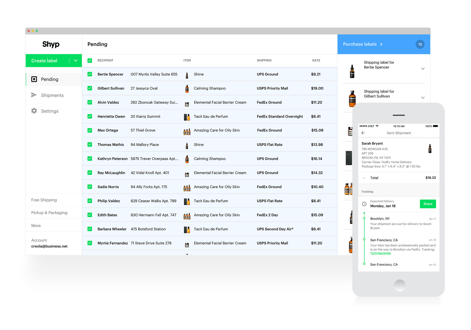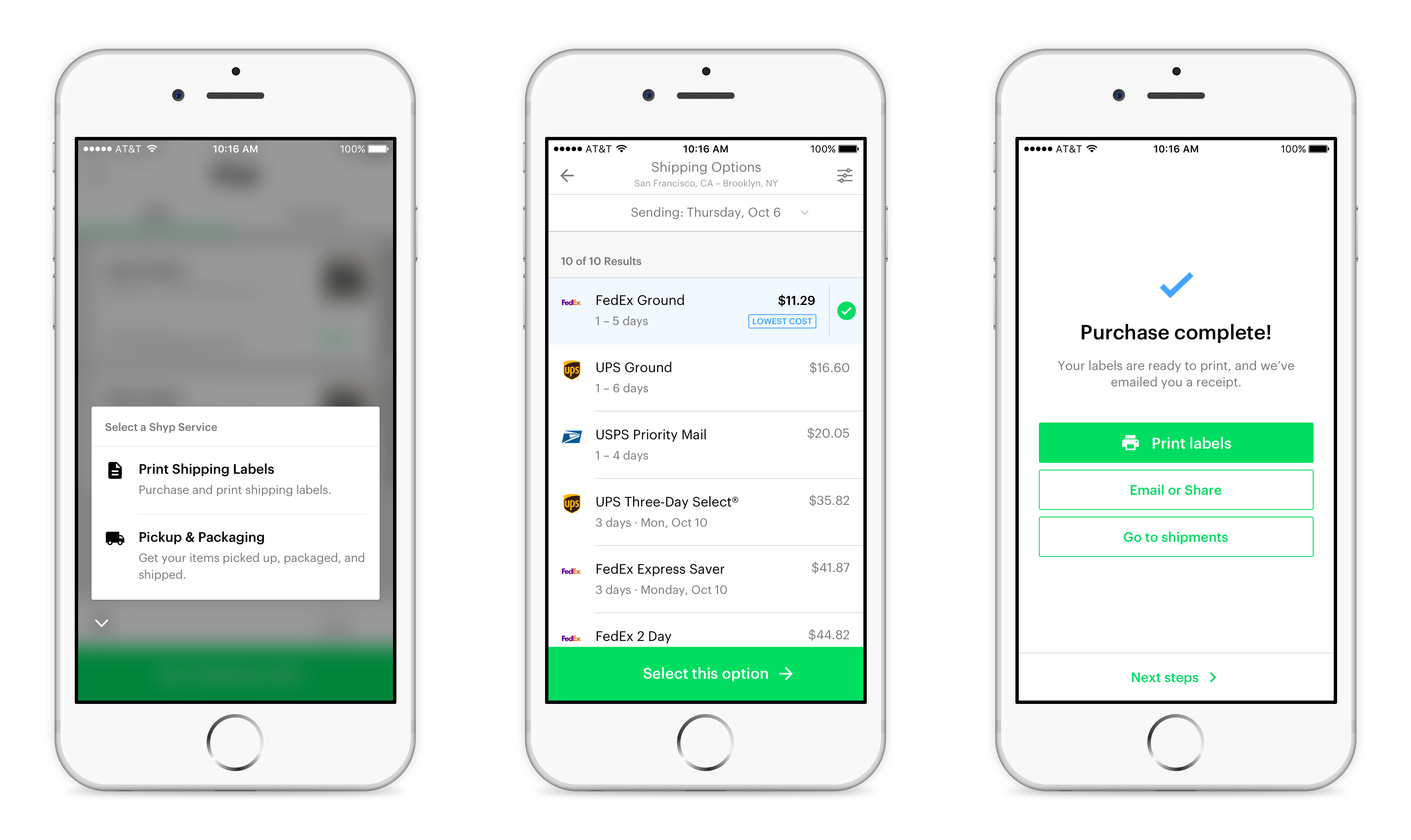 All-in-one shipping software + service. Snap a photo using our mobile app, or upload multiple orders to your computer. Select packaging, shipping, and extras like insurance. Then schedule a pickup, and we'll handle the rest. Flexible options for your unique needs. -Postage Always ship at the best rate across UPS, USPS, FedEx, DHL and more with Auto-Comparison, only from Shyp. -Pickup Cheaper than your carrier pickup, more convenient than a post office drop-off. Schedule a pickup 1 hour to 5 days in advance. -Packaging In-house expert services proven to reduce damage and costs, for computers to ceramics. Starting at $2/shipment, etc.