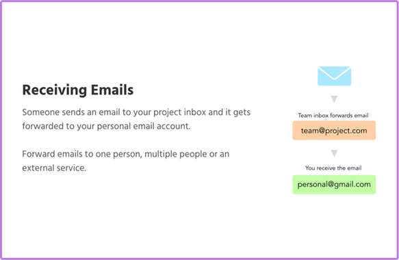 Receiving Emails Someone sends an email to your project inbox and it gets forwarded to your personal email account. Forward emails to one person, multiple people or an external service. Sending Emails Use your personal email account to write an email and select the inbox you'd like to send from. People will only see your project email address and you can keep your personal email private.