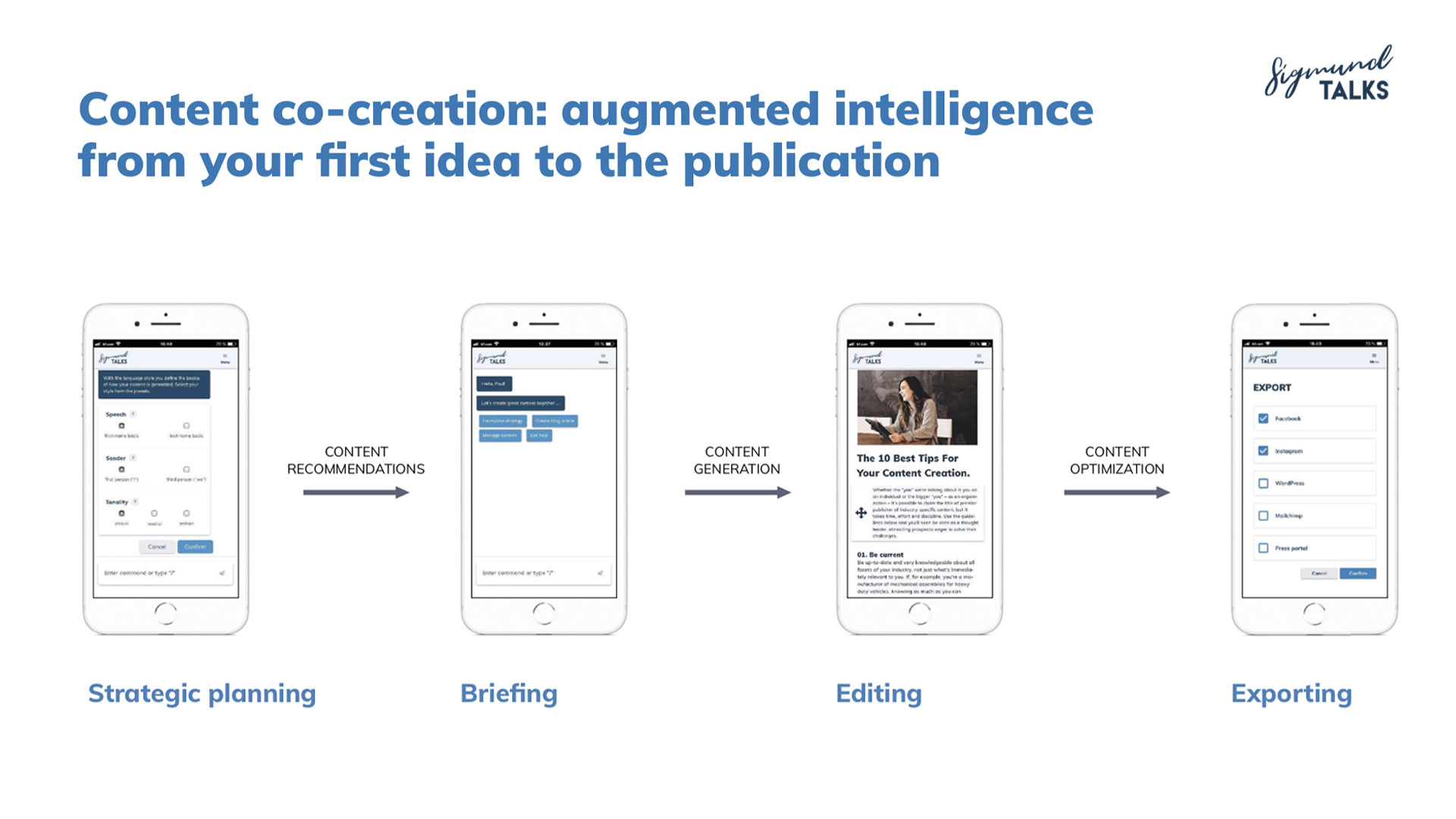 SIGMUND TALKS is the personal content assistant. As a chatbot, he advises and accompanies bloggers as well as small and medium-sized marketing teams in achieving their goals. Thanks to artificial intelligence and a unique co-creation process, users can create more diverse content in half the time! Sigmund provides users with context-based advice on their personal marketing and communications strategy. In joint discussions, he structures and generates parts of the content and accompanies users through the creative process - from the initial idea to creation and publication. Upgrade your creative process.