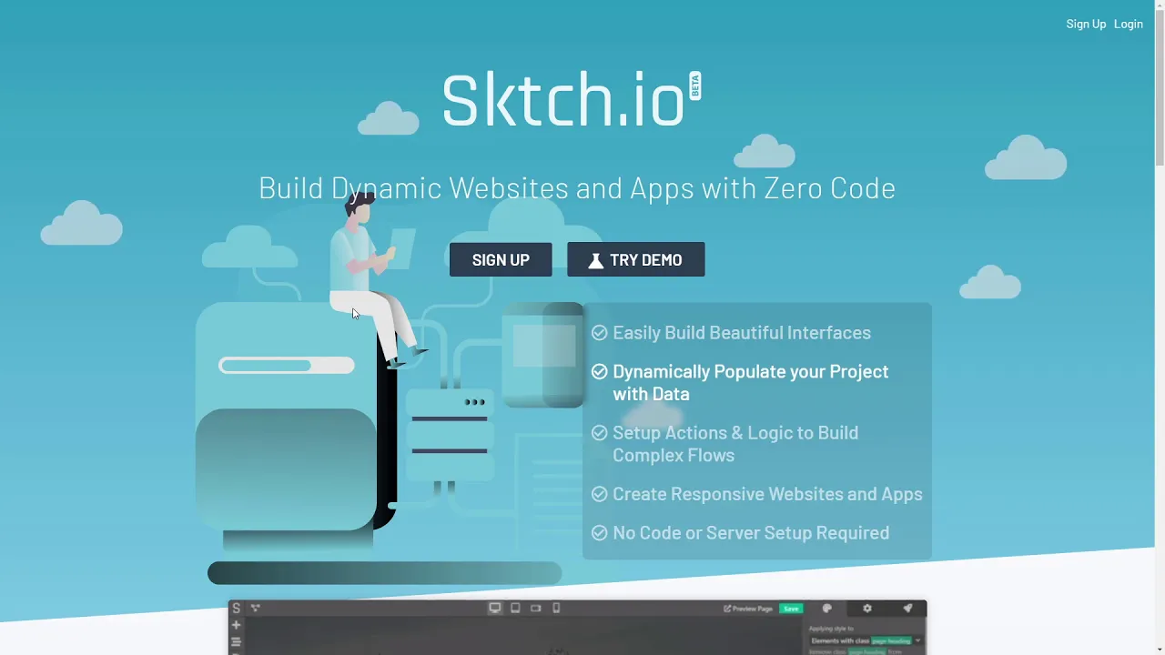 Sktch.io is a no-code platform allowing you to build dynamic and interactive websites or web-apps. With Sktch.io, not only can you build beautiful responsive websites and web-apps, but you can also integrate dynamic databases and build complex workflows with our visual programming tool, all without writing a single line of code. Sktch.io accelerates the creation of modern websites and apps. Whether you are a freelancer that is looking for a more productive workflow and powerful tools or a non-technical founder looking to build an MVP, Sktch.io is the right tool for the job!