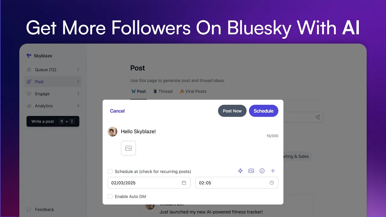 Skyblaze is an AI-powered growth and management platform designed specifically for Bluesky users. It helps creators, individuals, and businesses get more followers on Bluesky more effectively through a comprehensive suite of AI-enhanced tools. Key features include: - AI-powered content generation trained on 1,000+ viral posts - Smart post scheduling and content queue management - Automated AI engagement tools for building relationships - Advanced analytics to track post performance - Customizable AI writing assistant Whether you're just starting out or looking to scale your Bluesky presence, Skyblaze provides the tools needed to create better content, engage more effectively, and grow your audience faster - all powered by specialized AI trained specifically for the Bluesky platform.