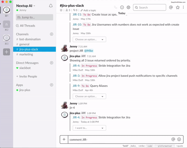 Jira Integration Plus for Slack supercharges the speed at which you create, assign, and transition work in Jira—without ever leaving Slack. The solution works for Jira Server and Cloud and a one time setup process enables the integration for all of your channels. Get more done in Slack with Jira Integration+