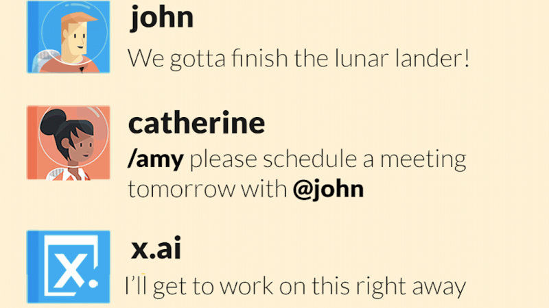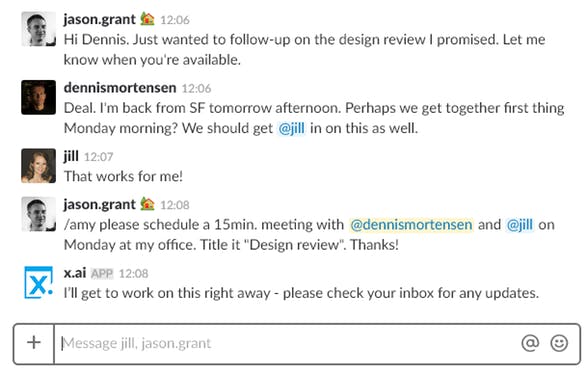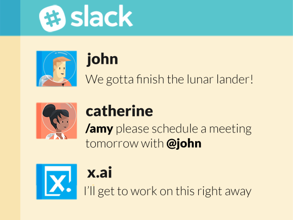 AI scheduling, now on Slack Scheduling meetings shouldn’t require astrophysics. Slack Amy + Andrew instead! -Schedule meetings on Slack. Boom. Schedule a meeting from any Slack channel. Type /amy or /andrew, add meeting details, and get back to work. -..or schedule via email. In the zone in your inbox? Amy + Andrew are scheduling pros on email too. CC either one to set up a meeting. No more tab surfing.