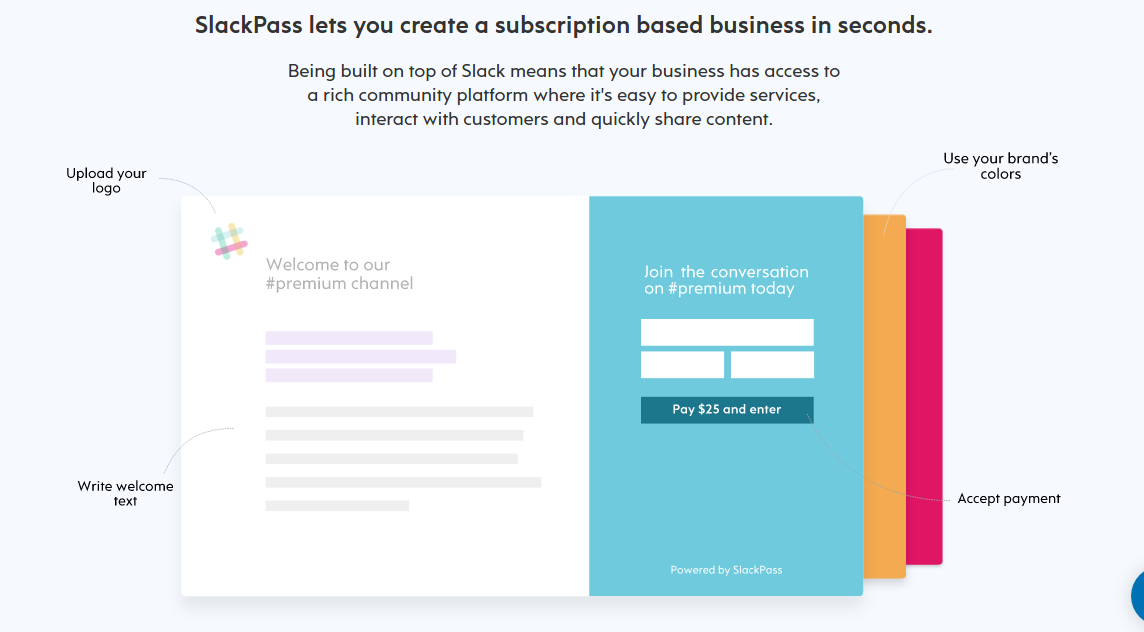 The best way to manage Slack invites.Create paid Slack channels and groups in minutes with SlackPass. SlackPass lets you create a subscription based business in seconds. Being built on top of Slack means that your business has access to a rich community platform where it's easy to provide services, interact with customers and quickly share content. Create beautiful custom invite pages or accept payment directly on your website by embedding our widget. SlackPass makes user management simple and your activity feed keeps your finger on the pulse of your community.