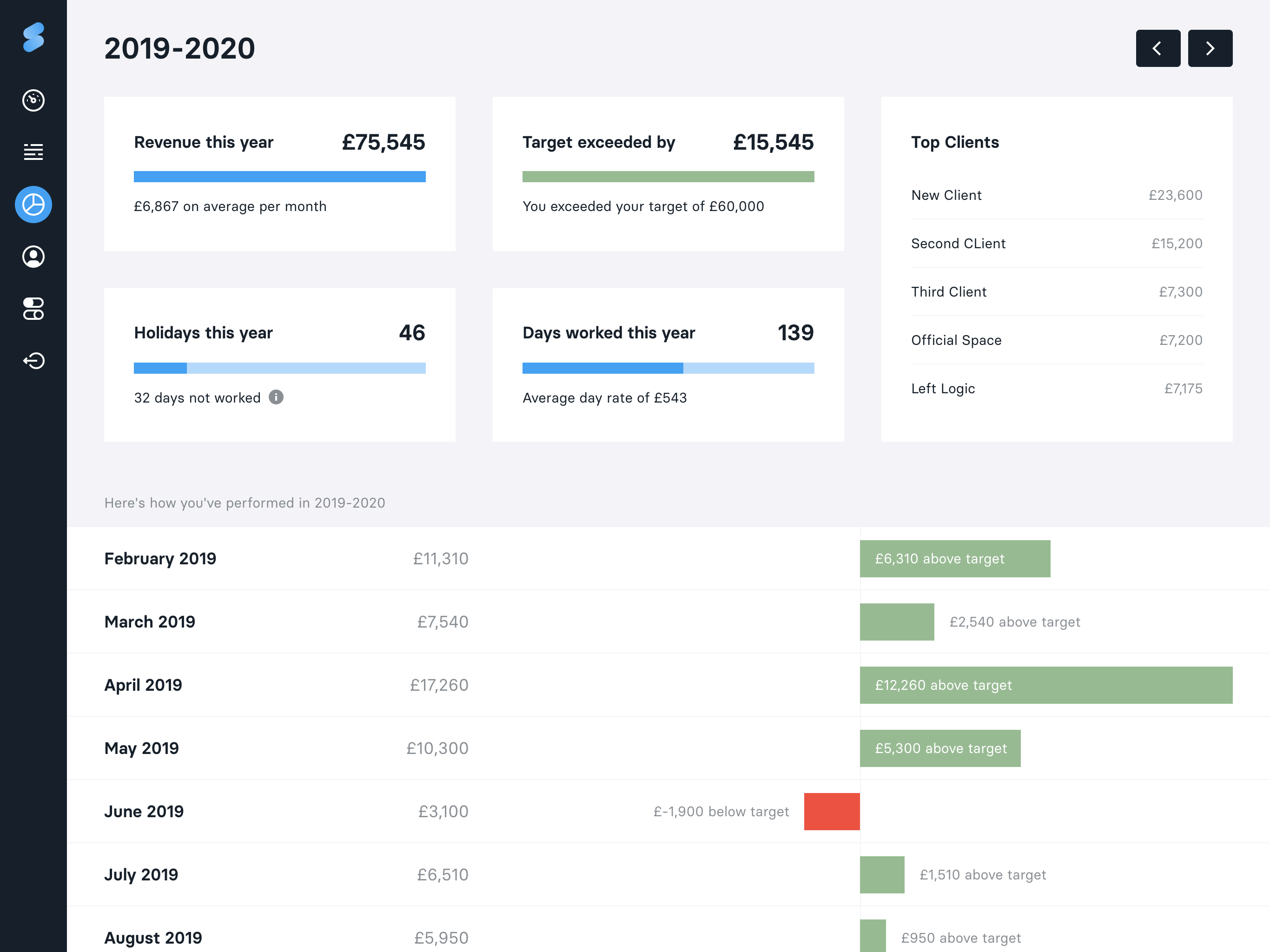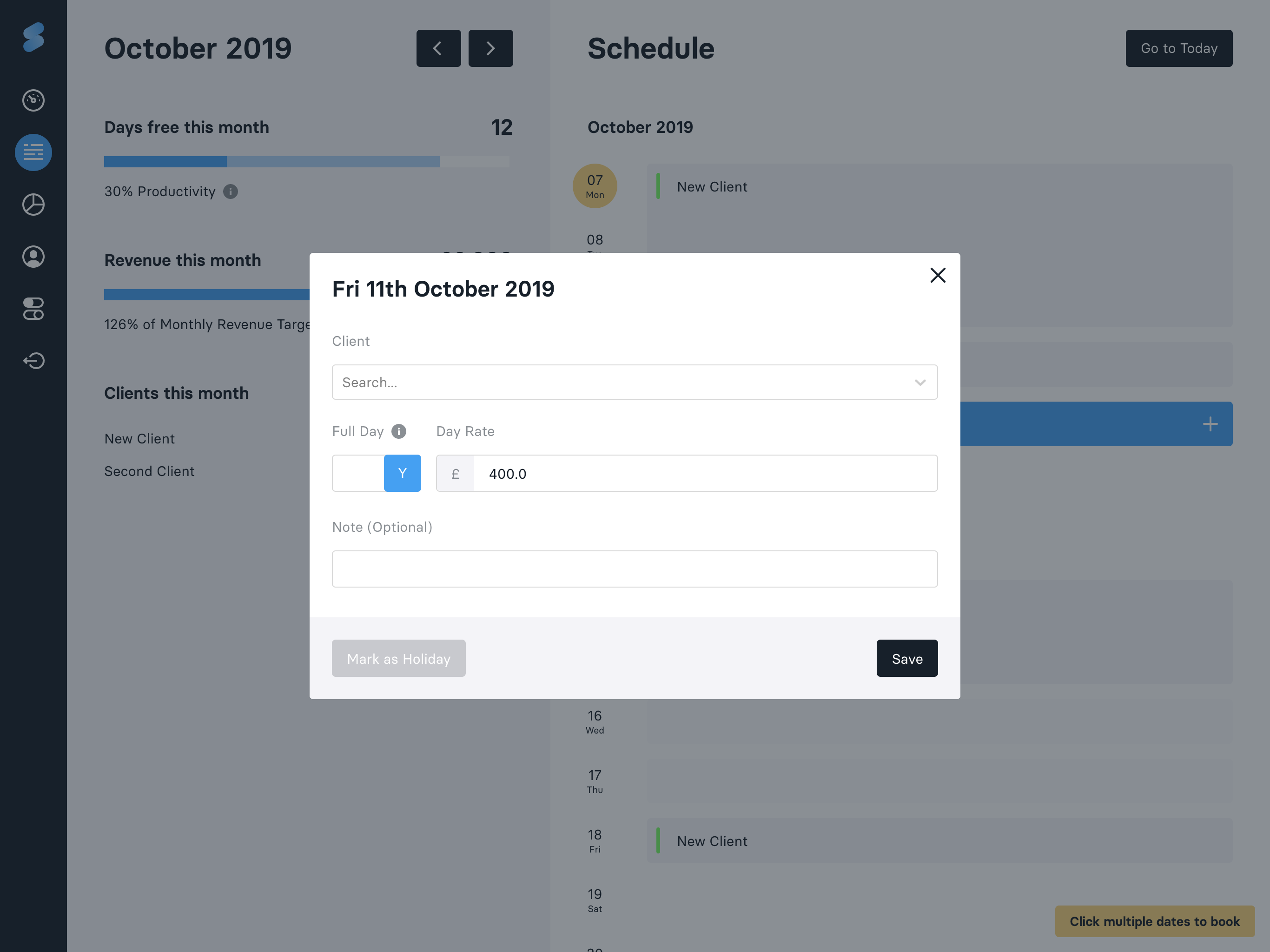 Being a freelancer is a rollercoaster of emotions. We've built Slate to give you clarity on your work schedule and make sure you're working towards your financial goals by helping you get answers to questions you have: * Am I going to meet my financial target this month/year? * How many more days do I need to work this year to meet my revenue target? * Am I too reliant on a client? * What would my revenue look like if I lost a client? * When am I next working for this client? * When am I next free for 10 days? * What does my schedule look like this month? * How productive have I been this year? * How many days holiday have I had? * How many days have I worked this year versus not worked? * How does this year compare with last year?
