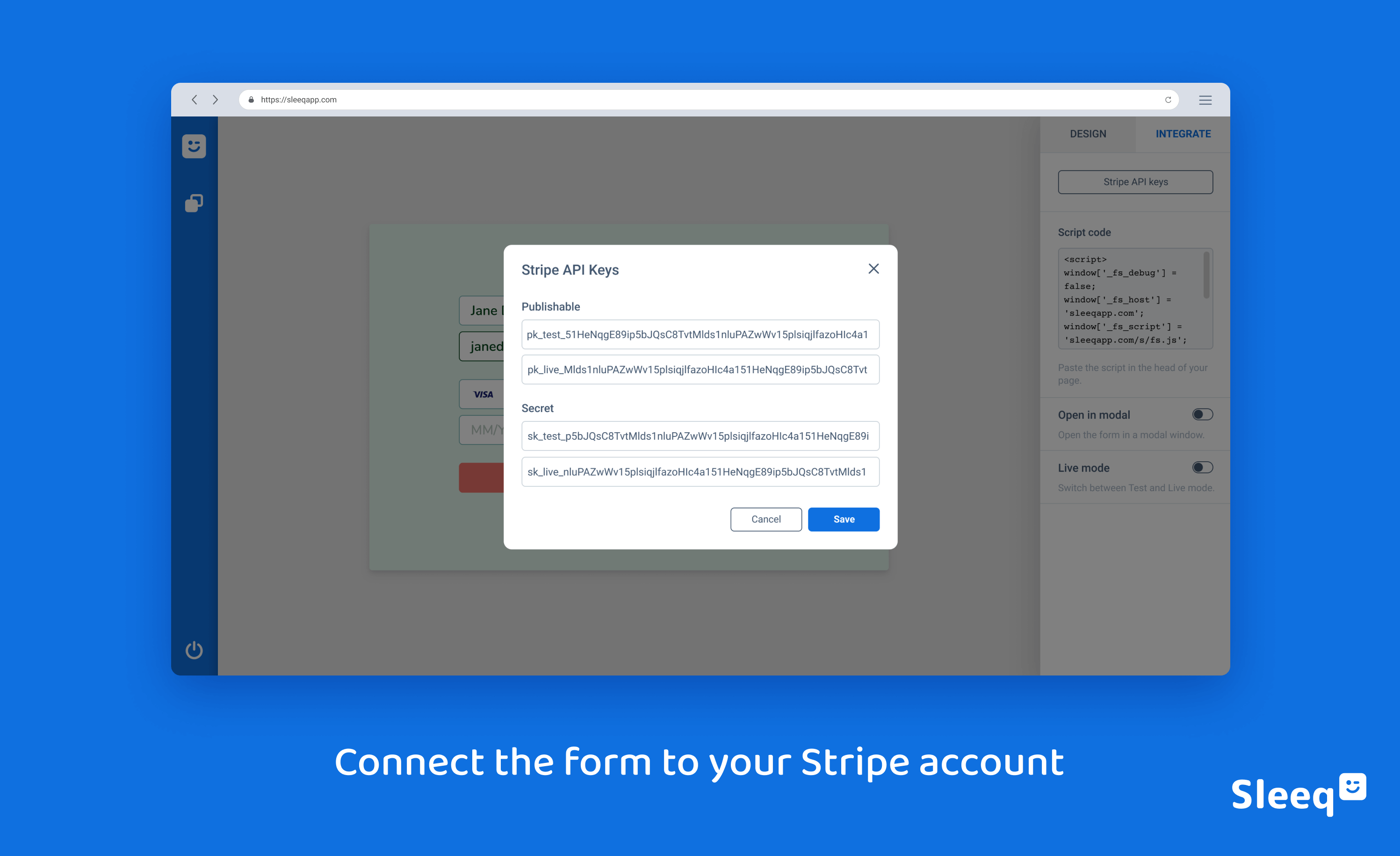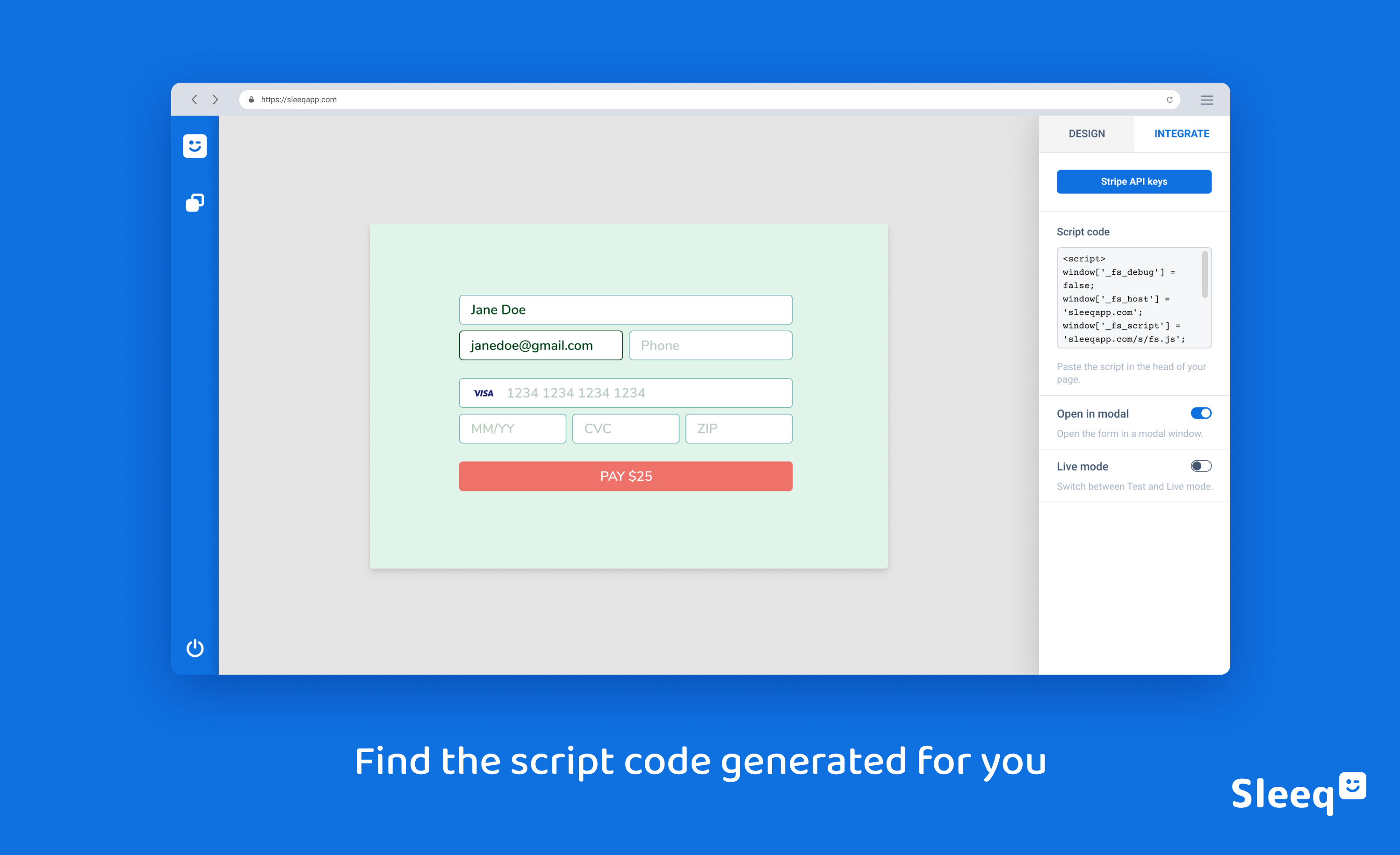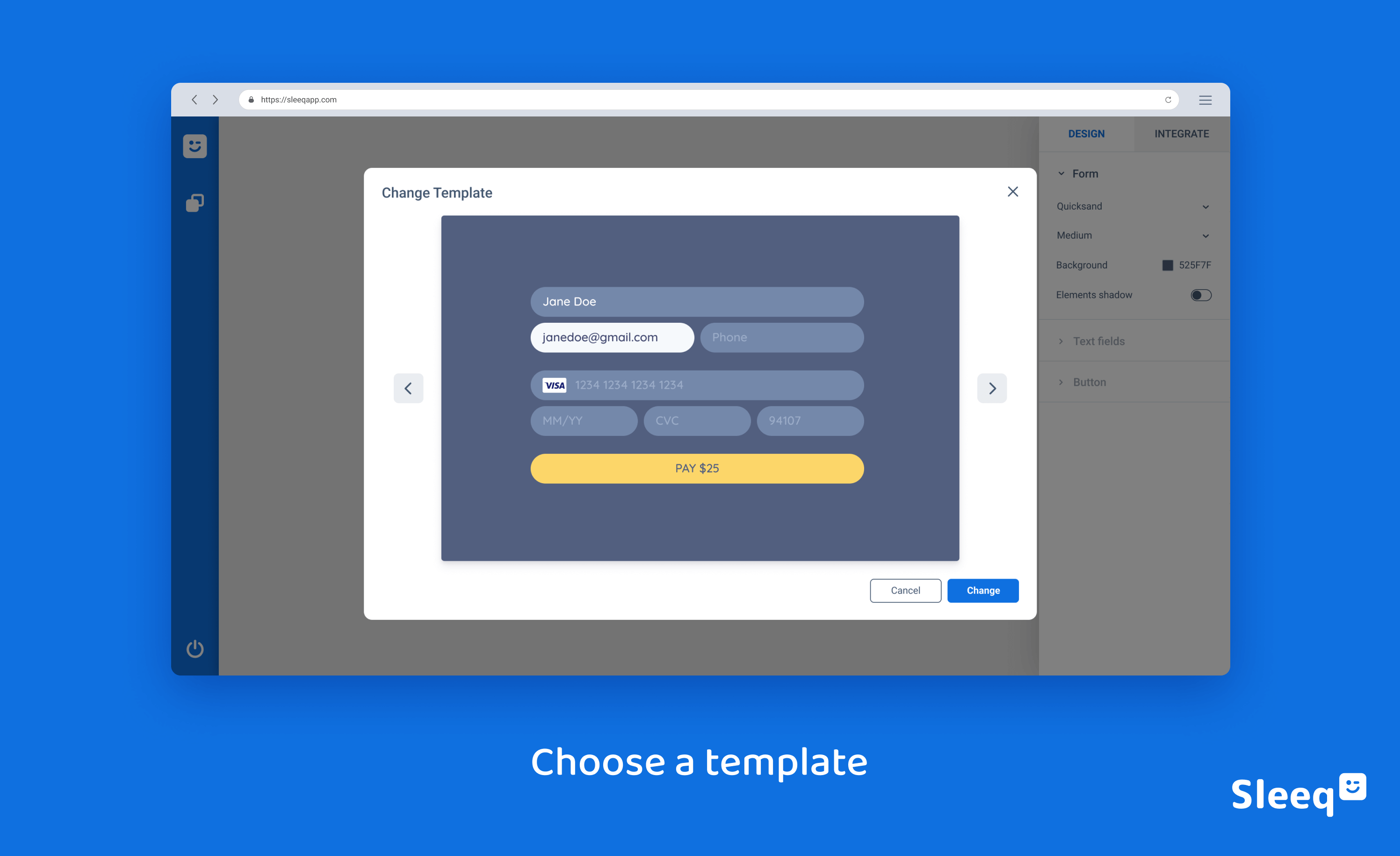 Sleeq is a web app that helps you create stylish payment forms and start collecting payments with Stripe in minutes. Pick a template from the gallery, customize it to match the style of your website, connect to Stripe in a few clicks, and paste the generated script on your page. No coding, fast, easy, and beautiful!