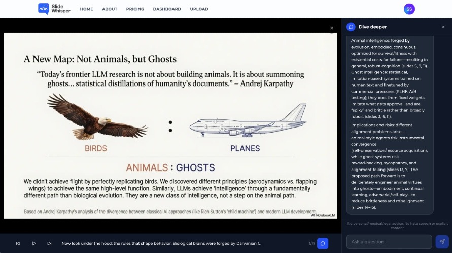 SlideWhisper transforms static slide decks into polished, AI-narrated presentations. Edit slide-by-slide scripts in a “green room,” export as video or share as a link, and add interactive Q&A so viewers can ask questions as they watch. Built-in analytics show engagement and what people are watching, skipping, and asking—ideal for sales, onboarding, and L&D.