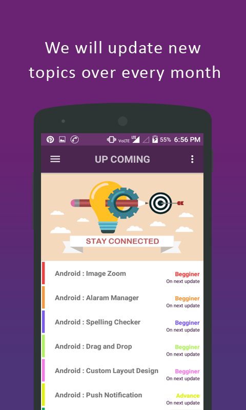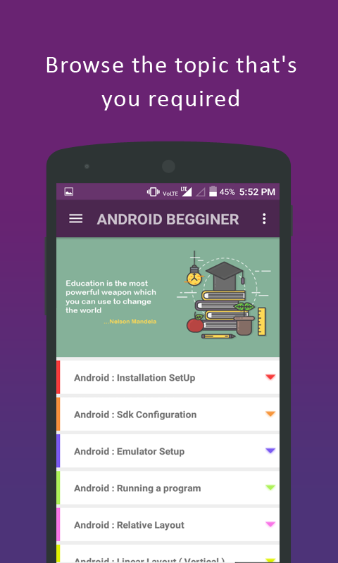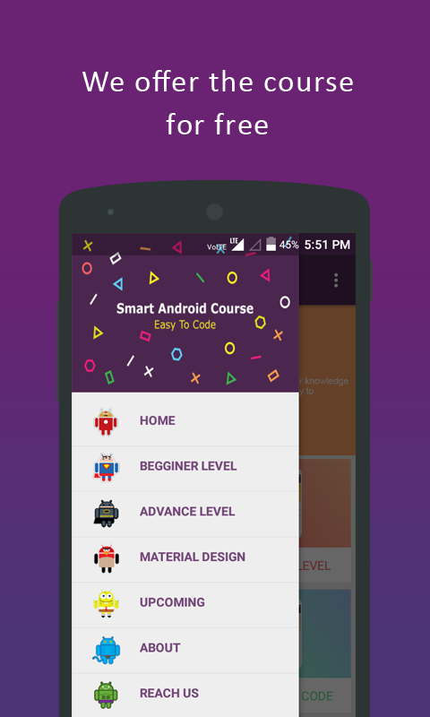 Smart Android Course is complete free offline android tutorial for the developers who want to explore their passion on developing skills. Short story about what we made over Smart Android Course ? We're a growing team of educator our mission is to deliver the knowledge to the future developer. so we thought to build an app based on android tutorials.In this app we cover most of the topic which are useful for the developers from mid to the intermediate level and you can also view the course over offline.The android developers who are interested in improving their knowledge can make use of this course Android Tutorial features? * We cover topics from mid to intermediate level on android development. * Read the course through the offline codes. * Easy to share and download the codes. * New topics were updated over every months. * If you had any suggestion feel free to reach us.