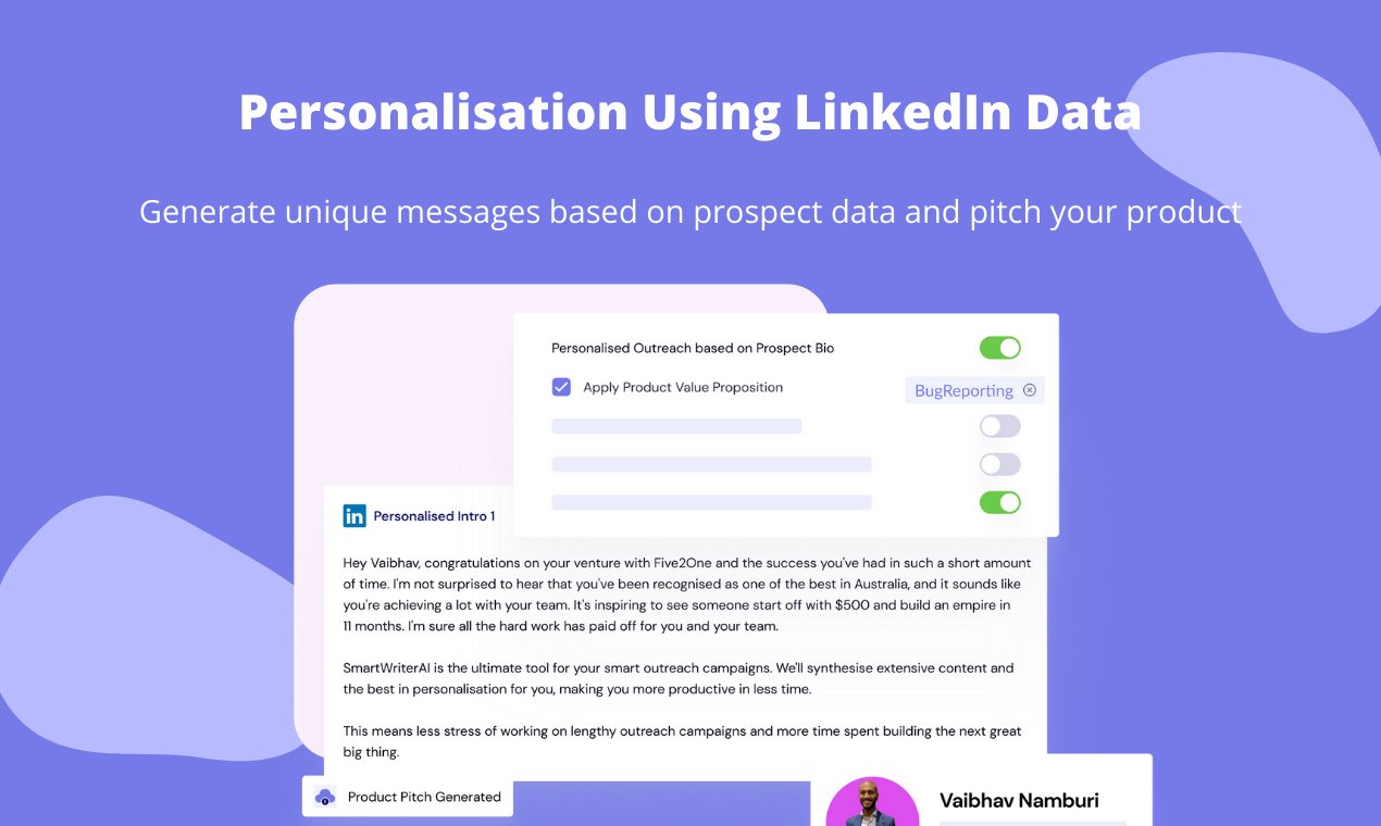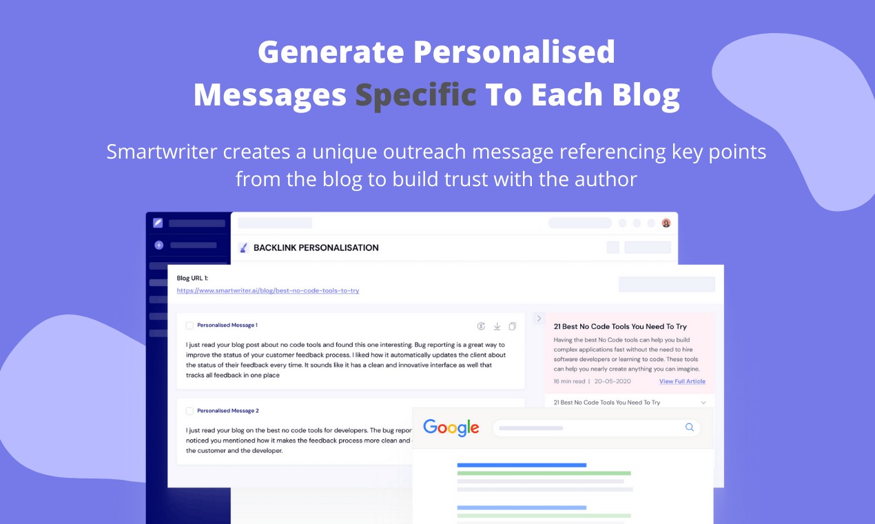 Smartwriter is personalisation outreach software that creates ultra-unique icebreakers using customer data such as their Linkedin profile, bio, job description, recommendations and recent activity. You personalise based on the companies case studies, blogs, news mentions or unique points about the firm SmartWriter lets you acquire 100s of backlinks in a click of a button with personalised outreach to help you insert links, replace competitors and get guest posts within seconds Use cases would be to send ultra personalised messages for cold outreach, backlink building, outbound b2b sales and building 1:1 relationships with prospects at scale