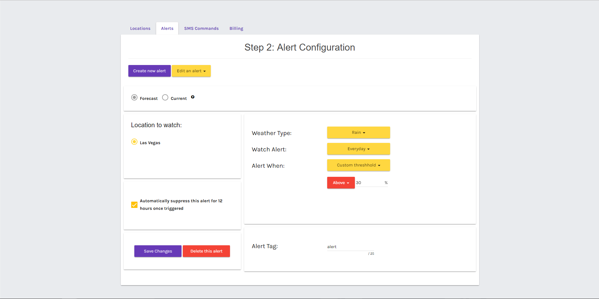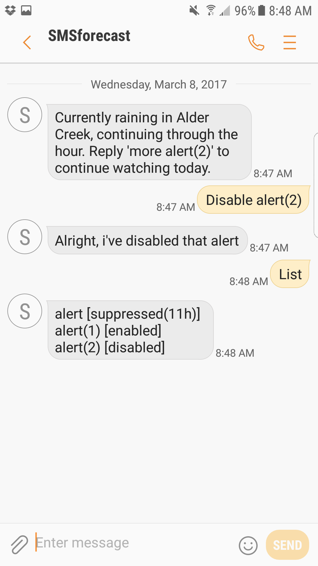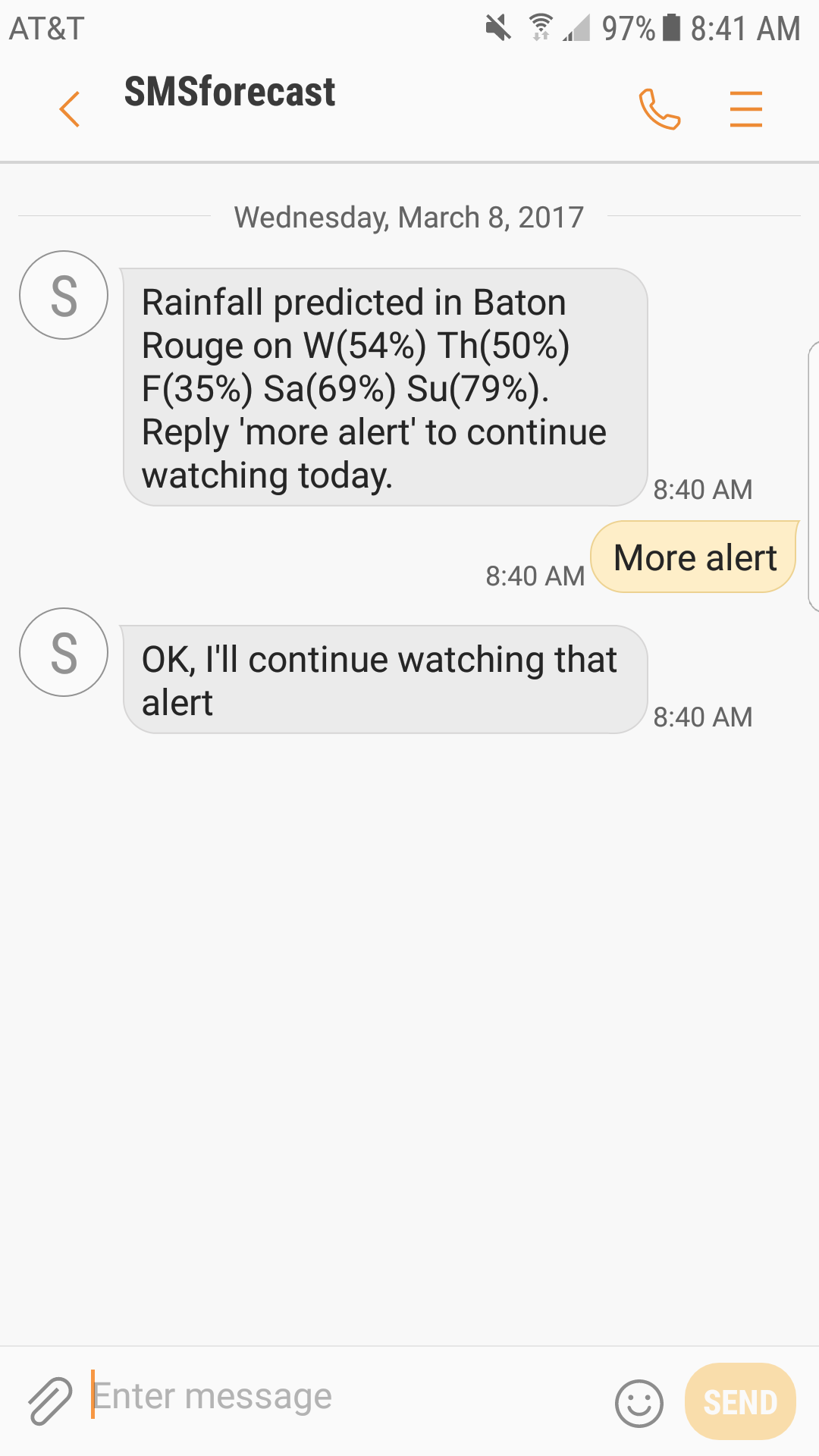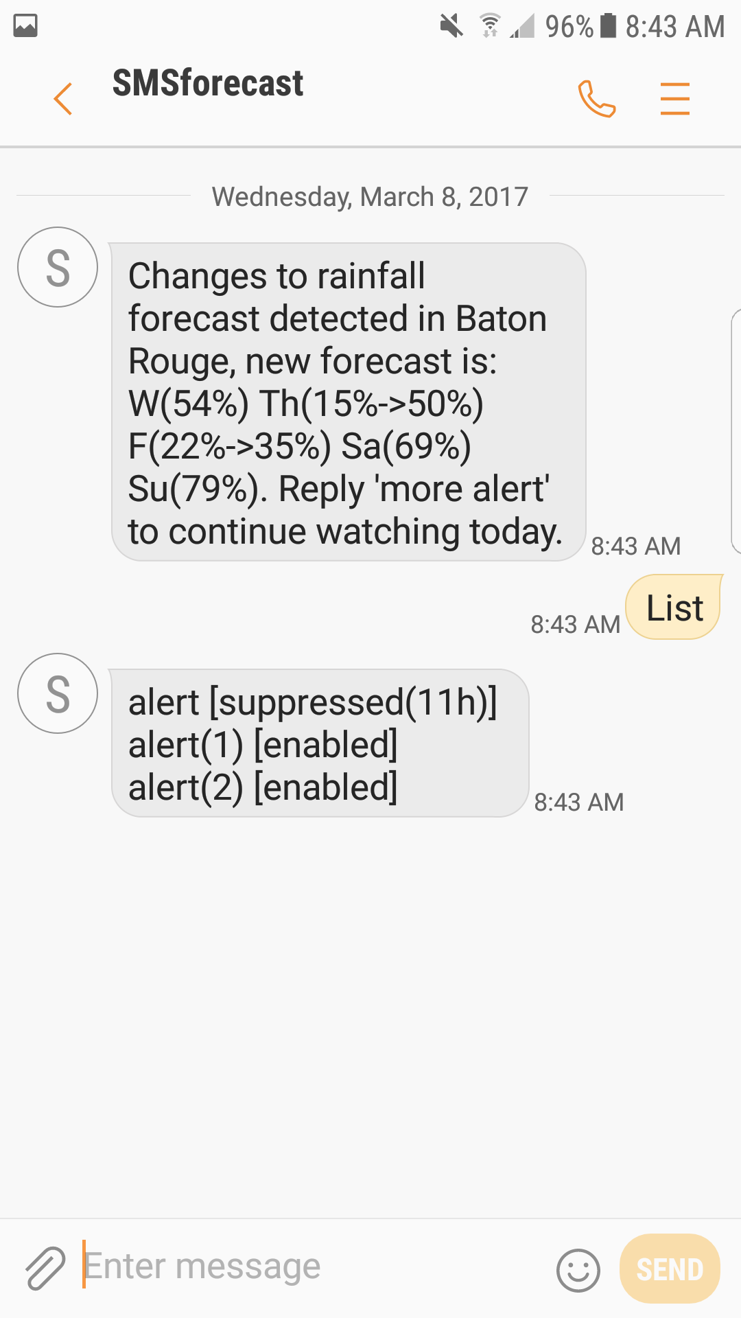 Ever made plans or make your way over to an event only to be caught off guard by bad weather? SMSforecast is designed to remove that inconvenience from your life by providing an automated weather watching service. Users can create and customize alerts to watch specific conditions such as rain, snow, wind, temperature, and humidity. Once created, we'll check the weather of the location specified by the alert every hour, every day, all year long. Gone will be the days of being caught off guard by rogue weather! Here are some use cases that you can configure your account to start watching within minutes: - Send me a text when there's a chance of rain in the next 6 days, and tell me what day - Send me a text if it's predicted to rain within the next hour in my city - Send me a text when the first snowfall hits in Brianhead - and plenty more possibilities! To celebrate the recent release, use the code 'LIVE' for a free month on us :) . Thanks all!
