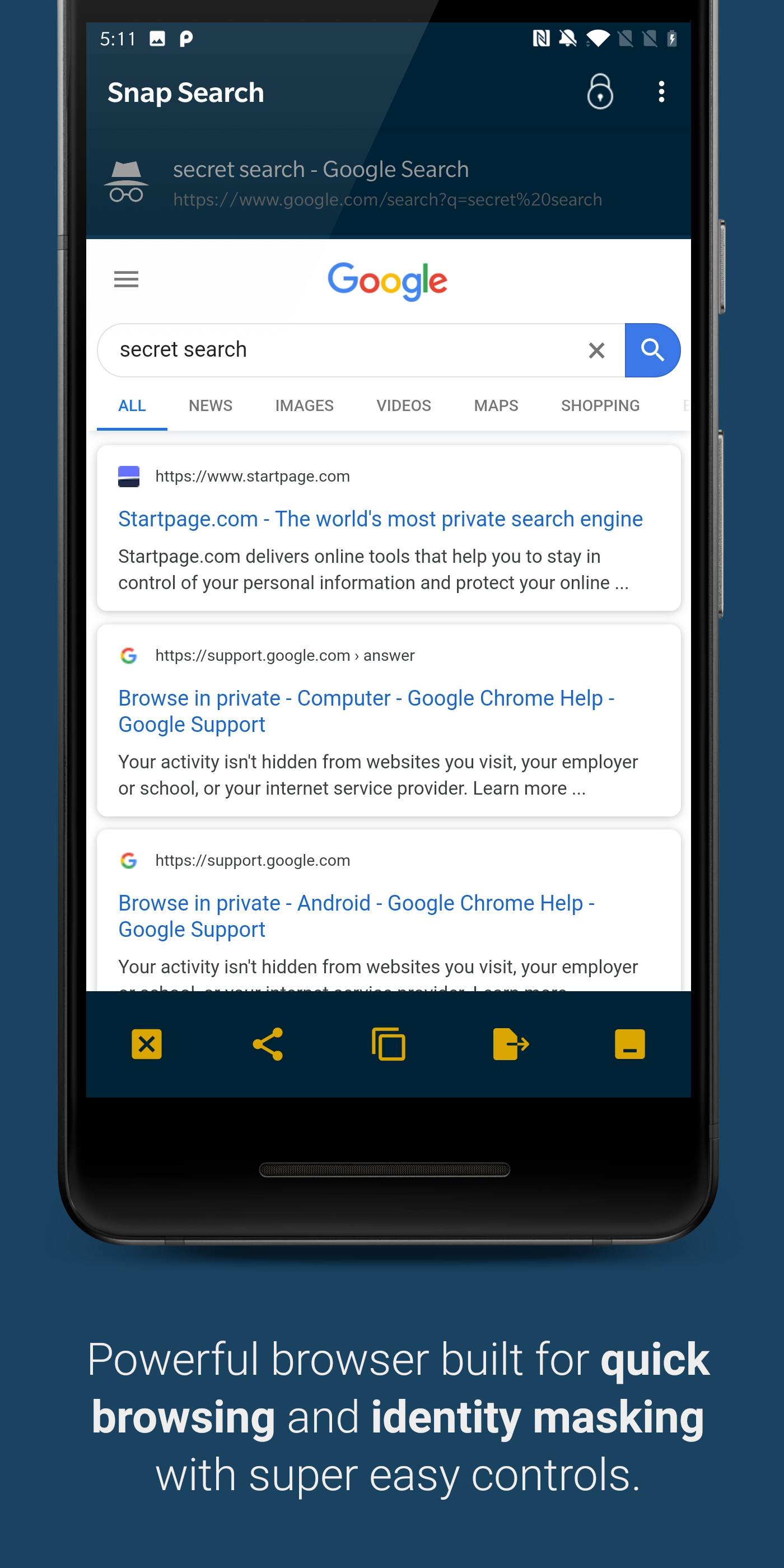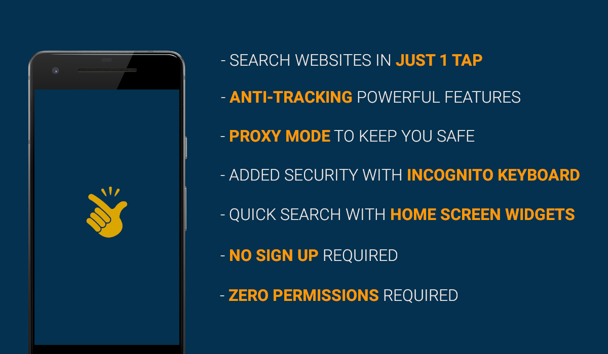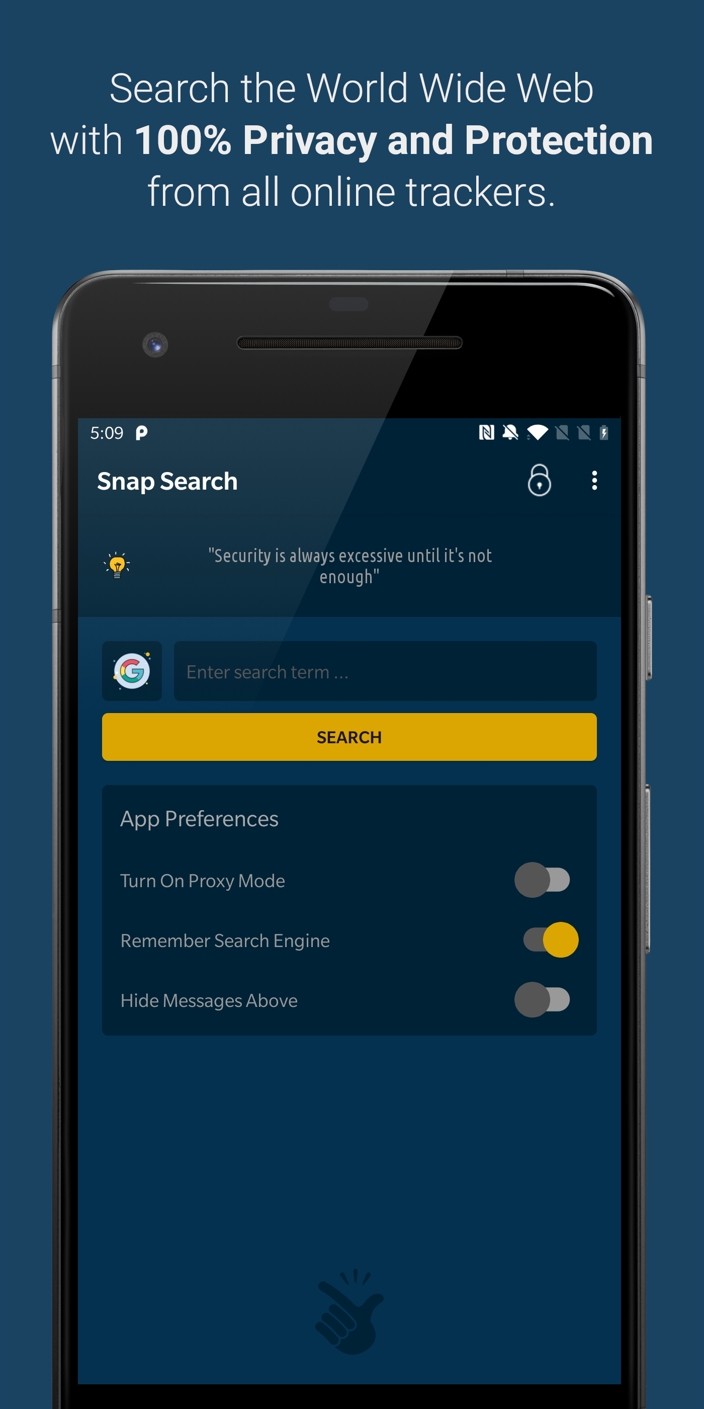 About Snap Search Searching the web should be an easy task. It should also be secure and private. Nobody likes getting tracked through their searches, nobody likes getting shopping or movie recommendations based on their last search online. There's a fool proof, 100% secure way to escape it now - Use Snap Search. Snap Search wants to provide the quickest way to search through your favourite websites in the easiest manner possible. Snap Search is incredibly simple: Step 1) Select your website ? Step 2) Enter your desired search term/keywords ? Step 3) TADA ! Browse through the search results in the most secure way possible. ? How are we so safe? Maintaining complete privacy for the users is right at the core of Snap Search. A number of steps have been taken to ensure the same. Some of them are: » Incognito mode for the keyboard: The keyboard doesn't remember or learn the words you type. » Browser precautions: Cookies, History, Cache Storage and even Javascript trackers have been turned off on the browser by default. » Proxy Mode: For users that want to go an extra mile, turning on proxy mode will bounce your request through our various VPN servers as well. » No Permissions: We don't ask for critical permissions like Location or Accounts, which prevents others from accessing it through us as well. » No Sign Up: You don't need to sign up and create an account at any point of time.