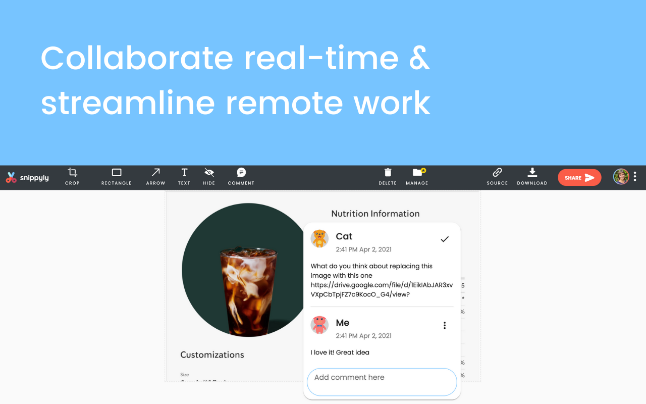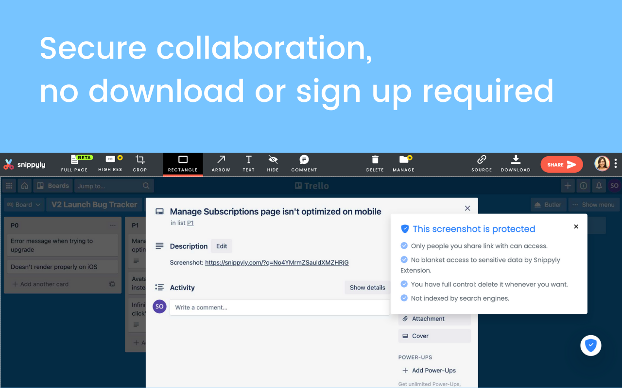 The fastest way to take full page screenshots and collaborate real-time with anyone around the world. Capture, edit, crop, comment, annotate, download or share your screenshots instantly using a link and without giving away your personal data. Make changes at the same time as your remote team just like Google Docs. Easily explain things, provide feedback and reduce the back and forth with your co-workers or customers. Snippyly is an external version of Google’s most used internal productivity and collaboration tool, built by two ex Googlers. Simple, no non-sense, no ads, no spyware, and no blanket permissions. This is a modern tool built with the latest and secure Google tech. All screenshots are stored anonymously on Snippyly servers. WHY USE SNIPPYLY DO MORE: Increase team productivity by eliminating endless back and forths via emails, Slack, Google Chat or Microsoft Teams. No need to set up meetings for everything REPORT BUGS: Report visual bugs to your developers directly into your project management tools and issue trackers (e.g. Jira, Trello, Asana, Notion, Airtable, GitHub, Google Sheets) COLLABORATE FASTER: Highlight important stuff, share ideas and ask questions in a company document, dashboard or personal project GIVE CLEAR FEEDBACK: Provide rapid and clear feedback on your websites and apps EXPLAIN CONCISELY: Add helpful visuals to your how-to tutorials SOLVE FASTER: Improve your customer support chat experience by efficiently troubleshooting and helping clients follow the right steps HOW IT WORKS 1. DOWNLOAD FOR FREE, ZERO PERMISSION REQUIRED Download the free extension. No permissions, no ads, no registration required. Easily access your extension from your address bar by pinning it like this: https://snippyly.com/?q=9EIO9Q0Cl4djGofCl0Gv 2. TAKE A SCREENSHOT Use any of these options: • Click on the extension icon to take a screenshot of any webpage. • Click on “Full Page” to capture the entire page. • Right-click and choose Snippyly from the context menu to take a 3-second time-delayed screenshot • Use Cmd/Ctrl + Shift + Y. To customize your shortcuts, go to: chrome://extensions/shortcuts 3. EDIT AND COMMENT Use any of these tools: • Crop • Annotate • Highlight important parts • Hide sensitive elements • Add comments (like Google Docs) 4. SHARE USING A LINK OR DOWNLOAD Use any of these options: • Share your screenshot via a unique view-access or edit-access link, for example in Slack, Google Chat, Microsoft Teams or in your project management tool (e.g. Jira, Trello, Asana, Notion, Airtable, GitHub) • Download it as an image (JPG format) 5. COLLABORATE IN REAL-TIME You and the people you share the screenshot link with edit-access can work together and make changes at the same time, just like with Google Docs. Engage in real-time discussions through comments with your team members or customers. PREMIUM FEATURES • Higher resolution screenshots • Slack integration • Domain restricted access • Screenshot management