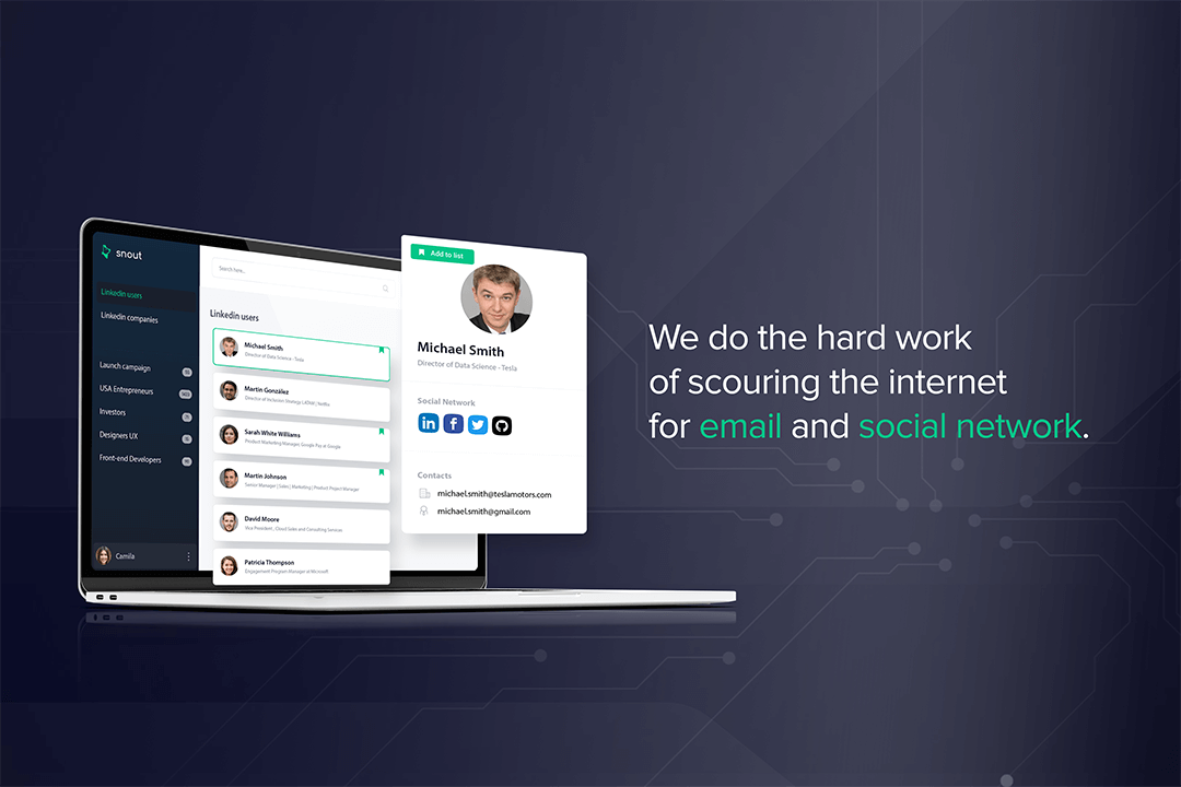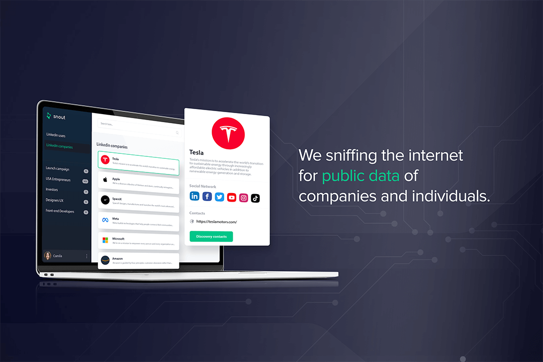 Snout works hard from sniffing public data on the internet to find emails and social networks of people and companies. ? Go beyond Linkedin's limits and access beyond 3rd degree, without range limit. ? Discover all publicly available emails from any company and access the direct contacts of key decision makers. ? Find key people for your business: customers, influencers, investors and employees. ? Take control of your audience by creating super-targeted email lists for your target audience. Our reach: ? 200+ Countries ? 57M+ Global companies ? 800M+ People profiles ? 150M+ Email Addresses (professional/personal)