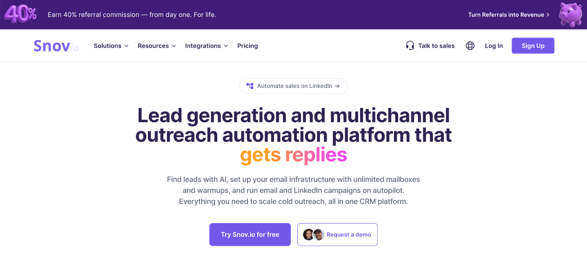 All-in-one email outreach and lead generation platform for scalable cold outreach Snov.io is an email outreach and sales automation platform that helps teams find verified prospects, launch personalized campaigns, and manage deals in one place. From lead discovery and email verification to multichannel outreach, mailbox warm-up, and pipeline management, Snov.io simplifies outbound prospecting and helps sales teams turn cold outreach into meetings and revenue. Chosen by over 3,000,000 users worldwide, Snov.io offers: Lead generation and prospecting tools that help users find decision-makers, collect verified contact data, and build high-quality prospect lists with features like Email Finder, Email Verifier, LinkedIn Automation, and browser-based prospecting tools. Outreach automation features that let teams create personalized cold email and LinkedIn campaigns, automate follow-ups, and run multichannel sequences at scale while keeping every interaction relevant and timely. Deliverability tools that help protect sender reputation and improve inbox placement through automated email warm-up, deliverability testing, DNS checks, and related mailbox health features. Built-in CRM, integrations, and API capabilities that help sales teams organize pipelines, sync data across their stack, and build custom workflows through native integrations, Zapier, and REST API access. With a built-in CRM available to all registered users and an ecosystem that combines prospecting, verification, outreach, deliverability, and integrations in one platform, Snov.io is a strong choice for SMBs, agencies, and growing sales teams looking to scale outbound efficiently.