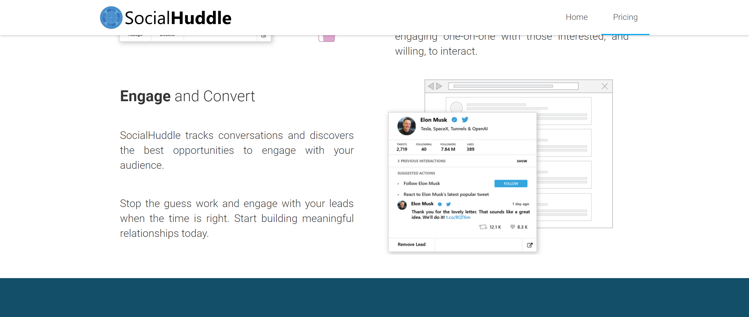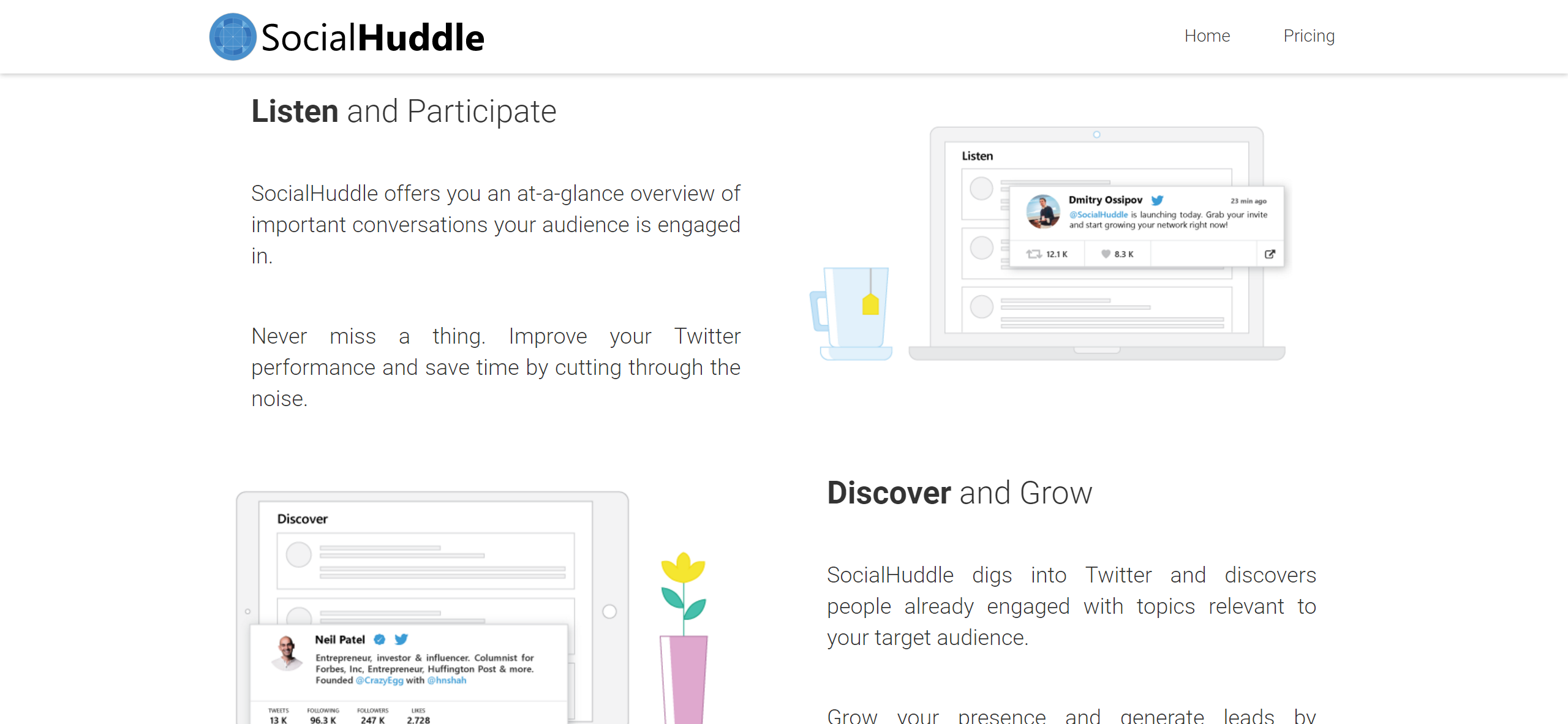 SocialHuddle is an online tool for Twitter Marketing created by and for Startups, Bloggers and Marketers. It allows you to dig into Twitter and discover Leads, suggest you the best way to engage them, as well as, keeps you up-to-date on topics discussed by your current audience. Grow your network and engage one-on-one with people interested in what you have to say. People trust friends, not ads. Start building meaningful relationships today!
