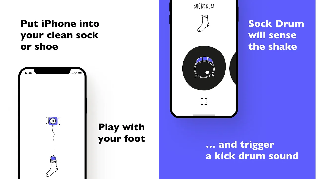 A kick drum for your live performances. Put it into your clean sock or shoe and play with your foot — Sock Drum will detect the shake and trigger a kick drum sound. App is perfect for accompanying your live guitar playing.