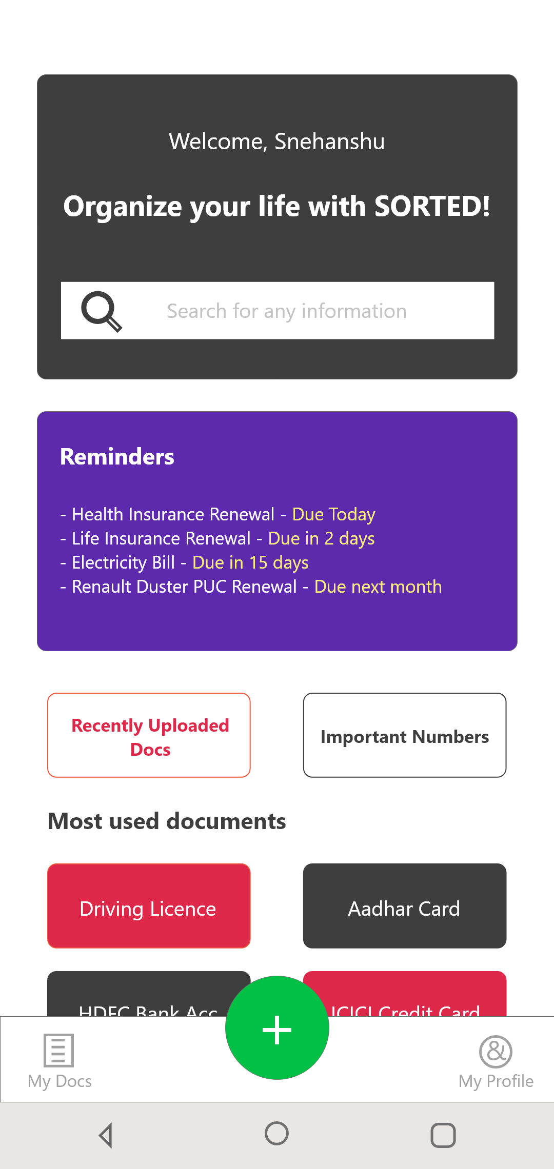 Sorted AI is a Personal Assistant to Manage Documents, which empowers users to automatically manage and share documents and critical information. Sorted AI takes care of the following - 1. Segregate your documents automatically under heads such as personal, education, medical, appliances etc 2. Extract important information from the documents such as warranty expiry, insurance expiry, customer support number, personal id number etc. 3. Sorted AI will provide you proactive alerts such as renewal dates, payment reminders etc.