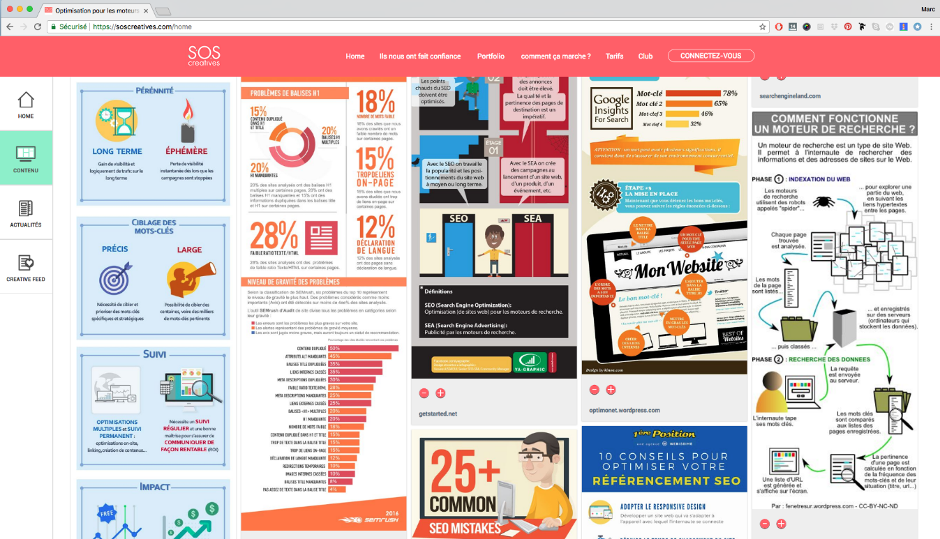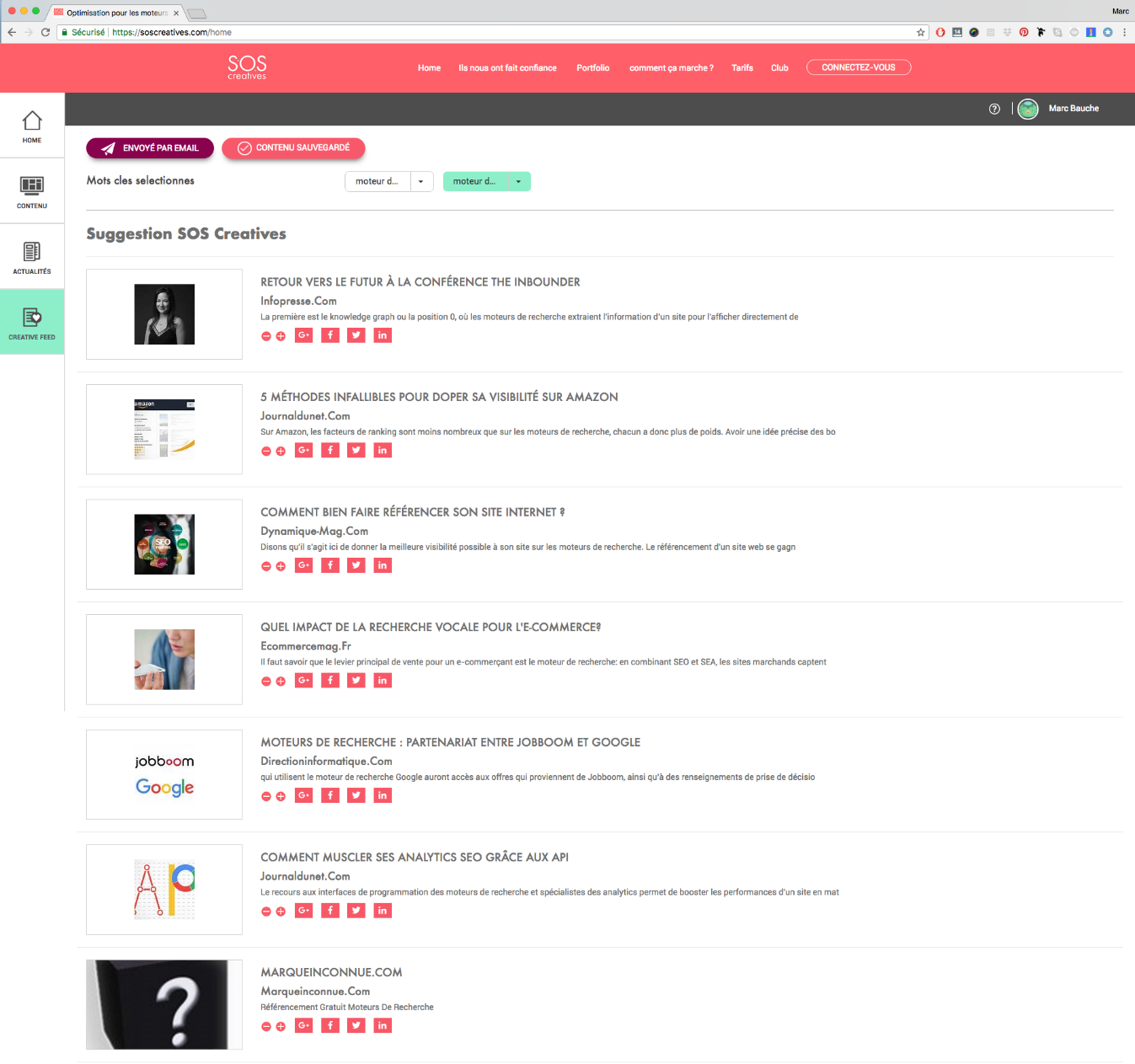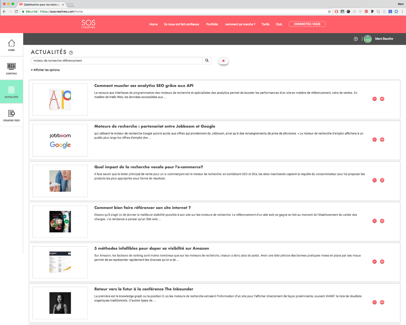 SOS Creatives dashboard allow you to find creative content for your website. Fil the key word you want to rank for and receive quality content to feed your creativity.