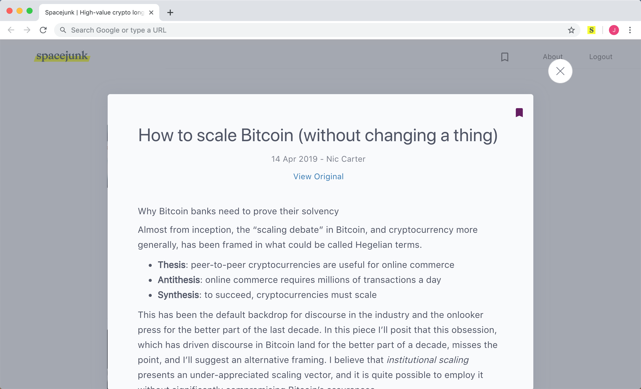 Spacejunk curates crypto long-reads and surfaces them in your new tab. Our mission is to accelerate crypto adoption #crypto #bitcoin Spacejunk curates crypto long-reads and surfaces them in every new tab. ?Saves you time from searching and vetting high-quality content ?Spreads great crypto ideas and research without the hype and FUD ?Provides a distraction free reading experience ?Surfaces fresh crypto reads daily OUR MISSION To accelerate crypto awareness and adoption via great ideas, research, and community. WHO'S IT FOR? Spacejunk is for anyone deep in the crypto space. Do you think about Bitcoin at night before you go to bed? Do you imagine a world where trust is the norm and systems work more effectively? Investors, developers, product builders, crypto-economists, marketers, and designers all use Spacejunk to stay informed and ahead of the pack. Crypto moves fast; with Spacejunk you can move faster. CONTACT Any questions? Drop us a line at [email protected]