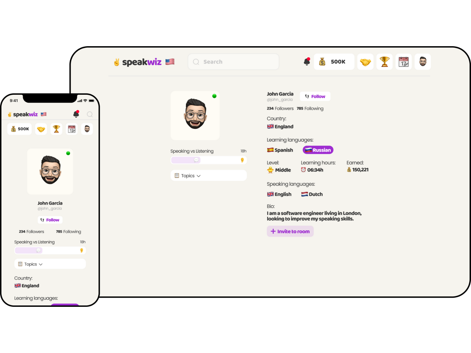 SpeakWiz is a multilingual platform where everyone can find an interlocutor in any foreign language. It is the perfect way to improve your language skills, speaking skills and language learning. Focusing on the most applicable aspect of language proficiency – speaking, SpeakWiz makes the process of learning a language much shorter, and provides enough motivation to stick to the process. SpeakWiz creates a place of gathering for people that want to learn, practice, teach or help others to learn a language. It is all around “rooms”. Rooms are intended for speaking in specific language about different topics. Any person, whether a teacher or a student can create a room. Others can join the room at their own will. This concept allows learners to learn or practice the language around a topic that they are truly interested in, which provides one type of motivation. Another type of motivation is given in SpeakWiz by adding gamification elements such as leaderboards and coins as a positive feedback that are interchangeable for virtual and physical goods that are perceived as valuable to the learner.
