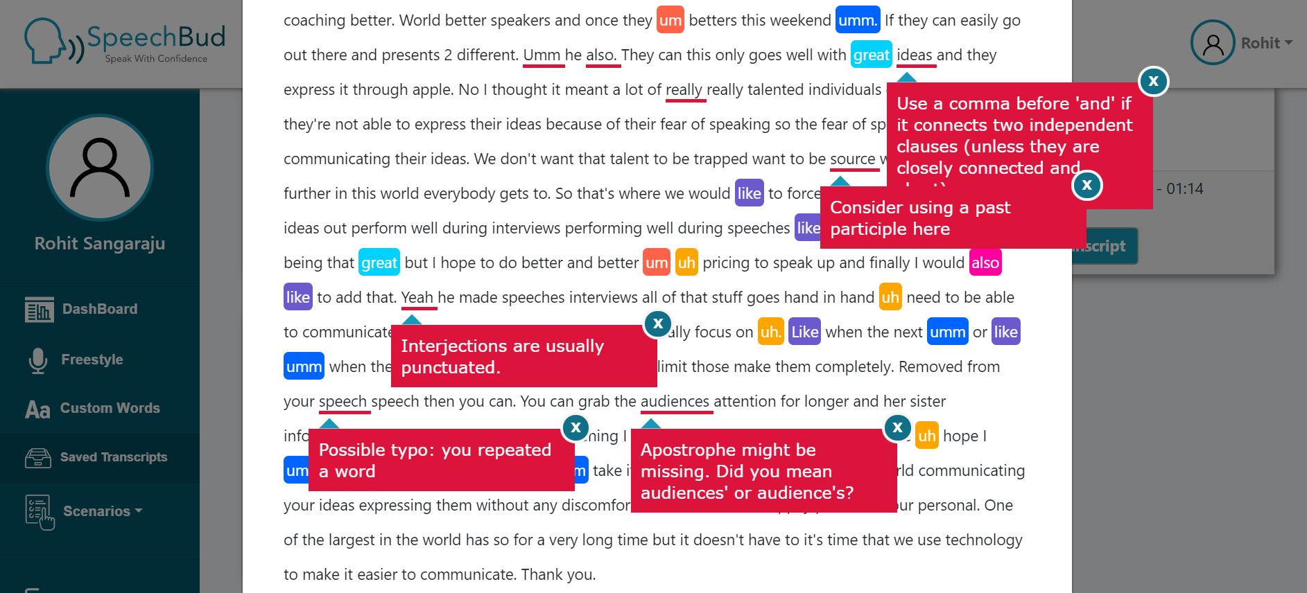 SpeechBud is a speech coaching application designed to help individuals improve their communication skills through a wide variety of tools such as: Live Transcription, Emotion Detection, Word-Highlighting, Pace Tracking, Live Thesaurus Feed and more! -While using the app please ensure you are in a quiet location to minimize unnecessary background noise. If possible, please use the microphones within your headphones or earphones for better clarity transcription! We are still in an early stage launch, and we understand that users may experience certain issues, so please feel free to provide any feedback and any recommendations! We are always looking to improve so our users can have the best experience possible. Please visit https://www.speakupapp.org to improve your communication skills and get yourself better prepared to tackle any communication challenge that you come across!
