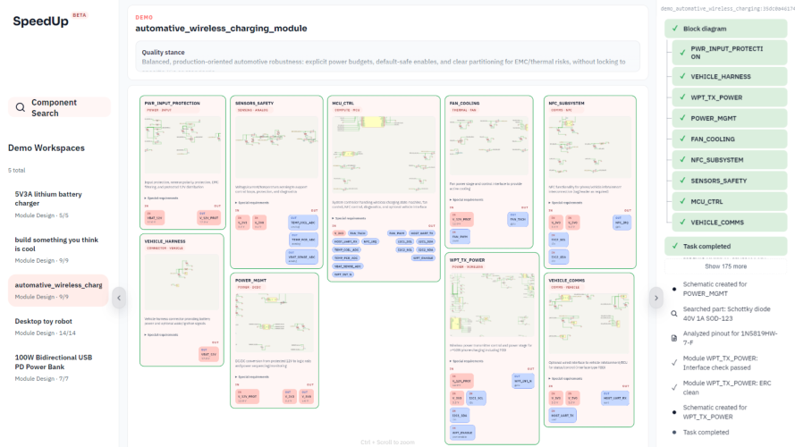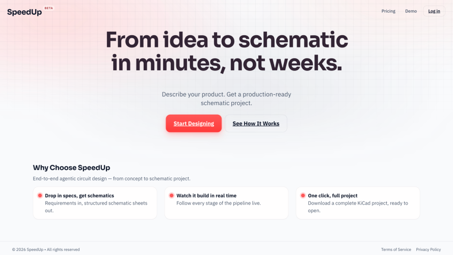 SpeedUp is an AI-powered tool that generates production-ready circuit schematics from plain-text product requirements and datasheets. Describe your idea, upload component specs, and watch AI build your schematic in real time — then download a complete KiCad project with one click. Key Features - Natural Language Input: Describe your product requirements in plain text and upload -component datasheets — no manual schematic entry needed. - Real-Time Design Visualization: Watch AI build your circuit step by step, from block diagram to module schematics, with live progress updates. - Human-in-the-Loop Review: Approve or revise the AI-generated block diagram before module design begins, keeping you in full control. - One-Click KiCad Export: Download a complete, production-ready KiCad project including schematic files and symbol libraries. - Automated ERC Validation: Built-in Electrical Rule Checks ensure your schematic is correct before export. - Component Intelligence: AI analyzes your uploaded datasheets to make informed component selections and circuit connections. Benefits - Save Weeks of Design Time: Go from product idea to complete circuit schematic in minutes instead of weeks of manual work. - Lower the Barrier to Hardware Design: Engineers and makers can prototype circuits without deep EDA expertise. - Reduce Human Error: Automated ERC checks and AI-driven component analysis catch mistakes early in the design process. - Iterate Faster: Revise requirements or rerun individual modules instantly — no need to start from scratch.