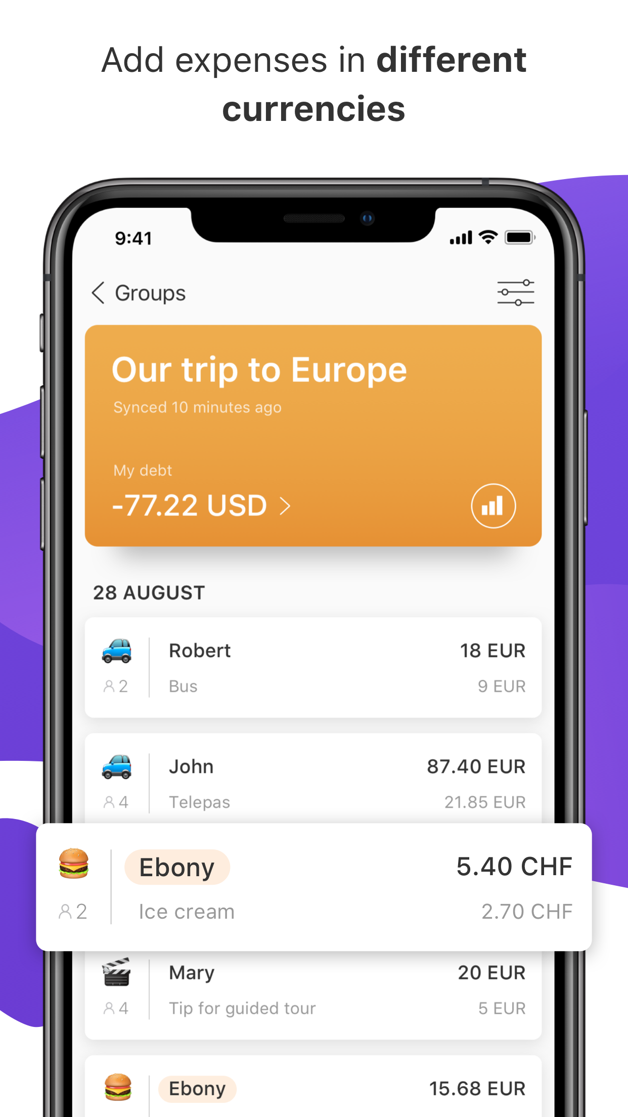 Spend Together is an app dedicated to help you and your friends manage joint expenses painlessly. It’s suitable for trips with friends, roommates, couples or any other IOUs. Get rid off paper bills and spend more time on things that matter, rather than arguing about who owes whom and how much. - SPLIT BILLS Just input bill details and Spend Together will do all the dirty work for you. It will calculate group debts and suggest optimal payments to settle them up. - SHARED ACCESS Send a personal invitation link to your friend to manage group expenses together. Each participant has full access to the group debts and data. - TRACK YOUR PERSONAL EXPENSES A comprehensive report will show your personal share in group expenses, so you can tell where your money goes (eg. on food, housing, transport, etc.). - ALL CURRENCIES Spend Together supports all currencies and forms reports using up-to-date exchange rates. Add expenses and settle debts in any convenient currency. - NO REGISTRATION, NO PERSONAL DATA We care about your privacy. Spend Together requires no registration or personal data. - WORKS OFFLINE All changes made offline will be securely synchronized with the server when internet connection is available. - APPLE WATCH SUPPORT Add expenses and track your group debts on the go with Apple Watch.