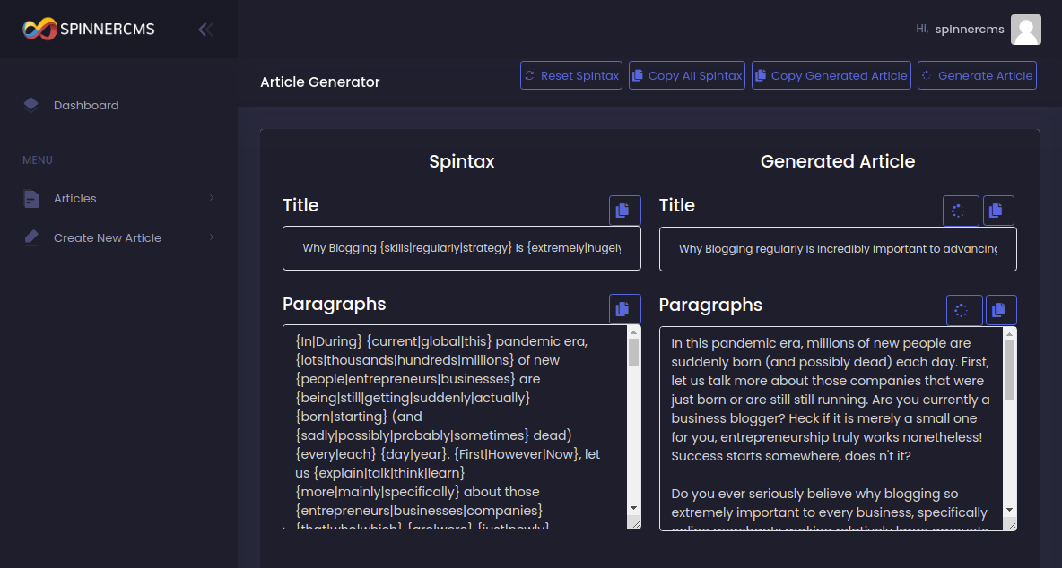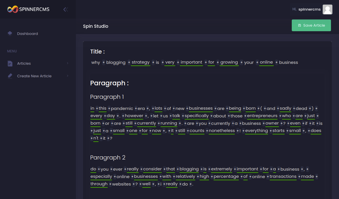 Gain the power of deep learning! SpinnerCMS provides you a browser-based article spinner that takes care of all heavy processing with our High-Performance Server on the cloud. Your PC will not be stressed out and importantly you will get the best synonyms and word recommendations. - Real Deep Learning to spin more articles with a high unique percentage yet still maintain readability. - Click the + button between words and you will get word predictions that you can use to make your article more interesting and unique. - SpinnerCMS not just gives you synonyms, but also contextual words recommendation. - No more spaghetti on your editor. Edit comfortably and spin faster with our easy to use Spinner Studio. Reduce repeatable job by using our spinner features, from reproducing your article into multiple new unique articles or describe multiple products without the same (boring) description.