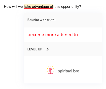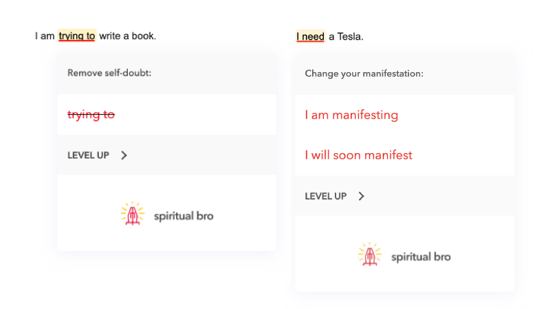 Spiritual Bro is a community-driven, startup studio building products and experiences that elevate the human frequency. Our first product, Spirit Check, is a browser-based writing assistant enables more conscious composition; removing negative introjects and acting as a mechanized, linguistic therapy.