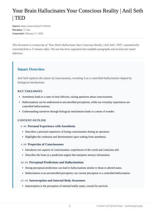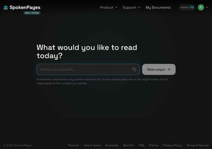 # SpokenPages turns video into reading. A focused tool that transforms spoken YouTube content into clean, readable documents you can keep. --- ## What is SpokenPages? SpokenPages is a simple, purpose-built service for people who prefer reading over replaying. Paste a YouTube link and get a well-structured PDF you can actually read. We focus on document quality: paragraphs that feel natural, typography that feels calm, and a layout that respects your attention. It is not an AI playground, it is a reading product. If you want to save ideas, study lectures, or revisit long conversations without scrubbing a timeline, this is built for that. --- ## Not captions. We listen to the video. Most transcript tools depend on YouTube captions. SpokenPages starts from the sound, so quality is higher and it still works when captions do not exist. The result is the same promise: a beautiful document that reads like a book, not a caption dump.